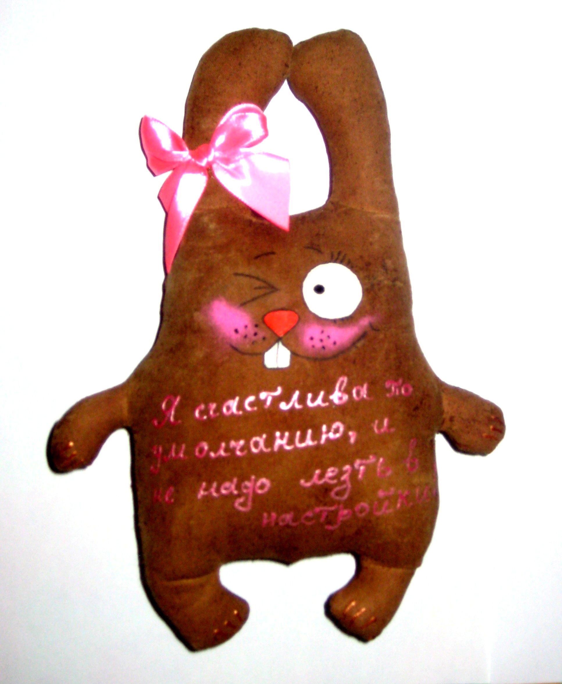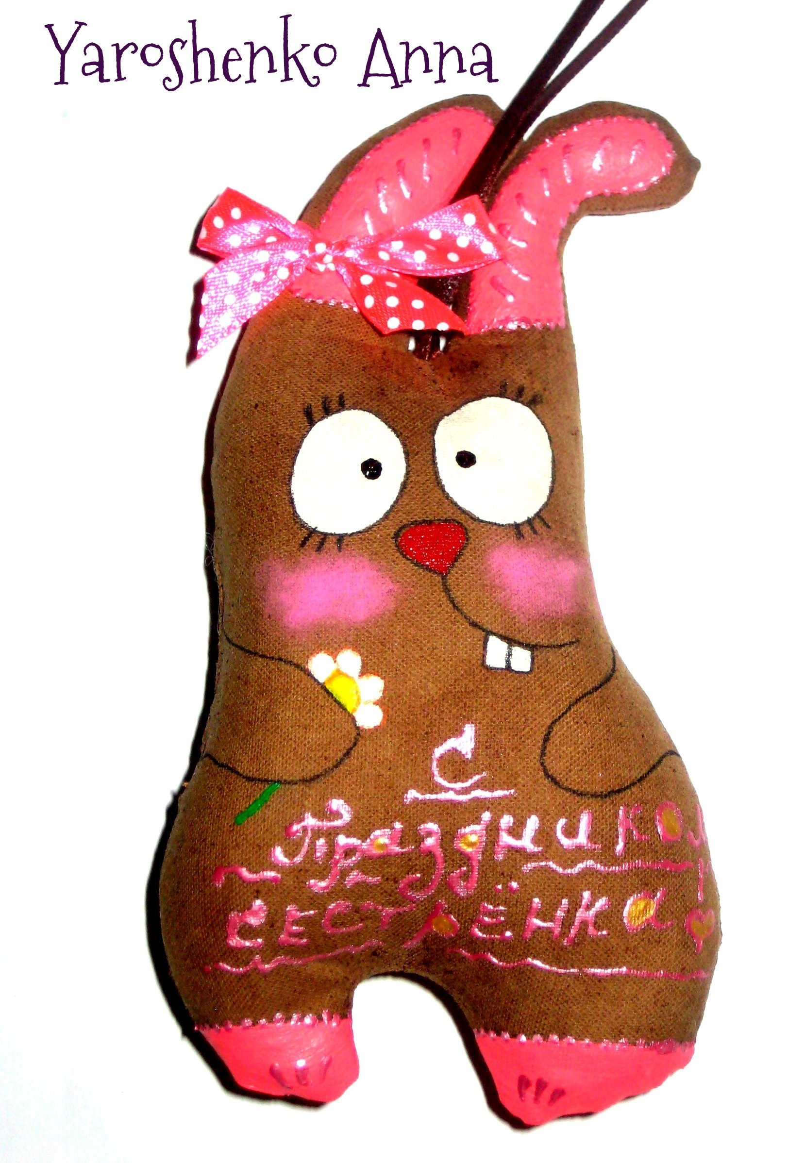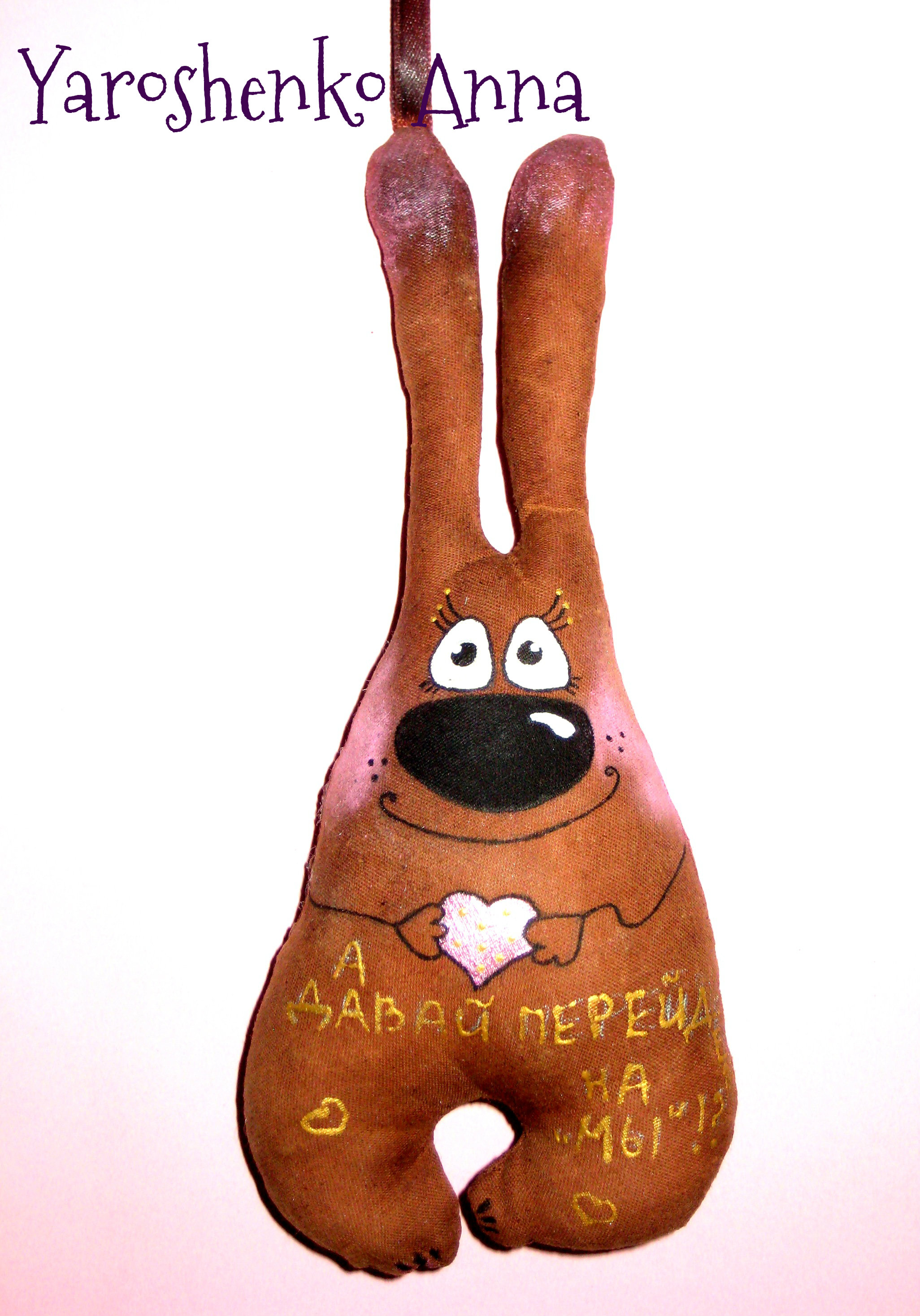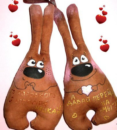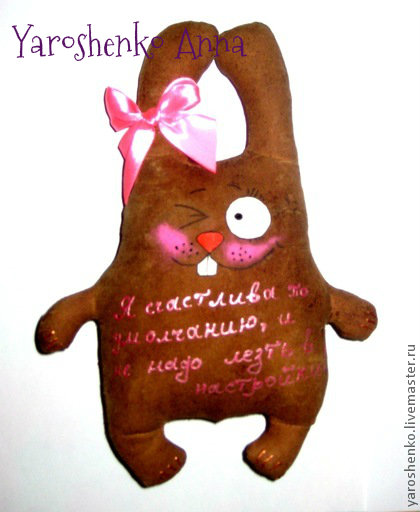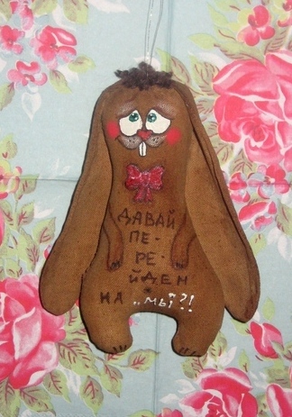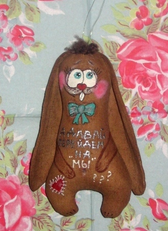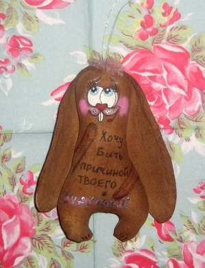 Зайки Позитивные ( :)) )пошиты из натуральной ткани, тонированы кофе, корицей и ванилью, расписаны вручную акриловыми красками, снабжены петельками для подвешивания. 14 февраля такой подарок будет прекрасным презентом для любимого человека или, кому-то, возможно, поможет намекнуть о своих чувствах))) Возможно изготовление на заказ и с другими рисунками, надписями. Цена указана за 1 зайку, при заказе от 5 игрушек- Скидки!