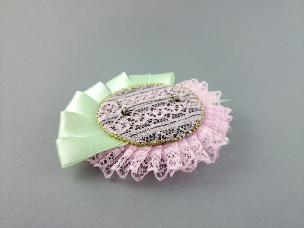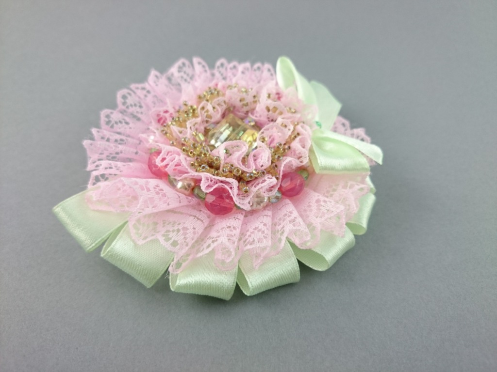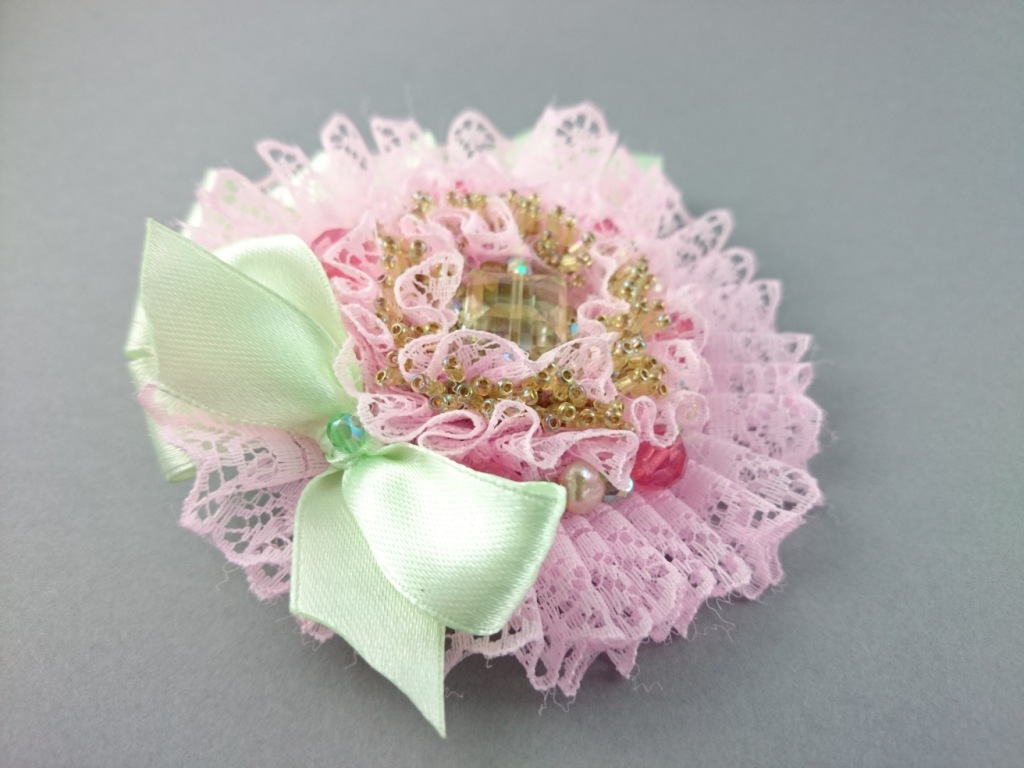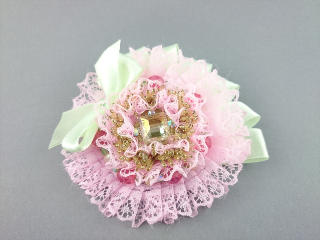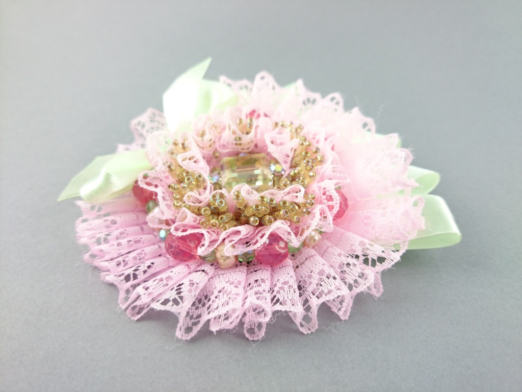 Materials: Green ribbon, pink lace, Czech glass crystals, glass crystals, TOHO Seed beads