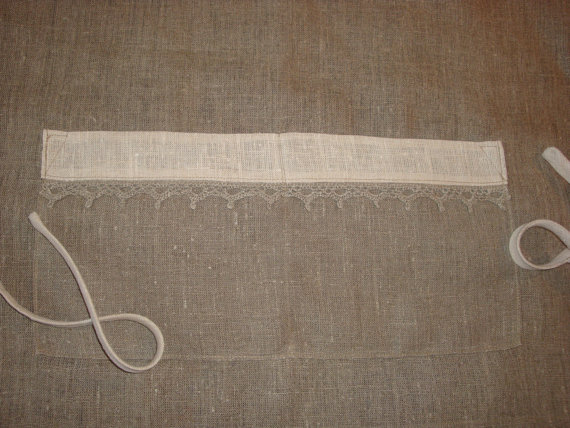 Apron 100 percent linen, dark with white crochet embroidered trim, two front pockets with crochet lace