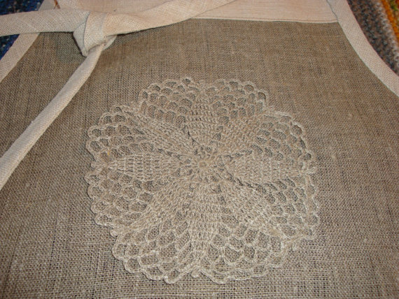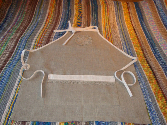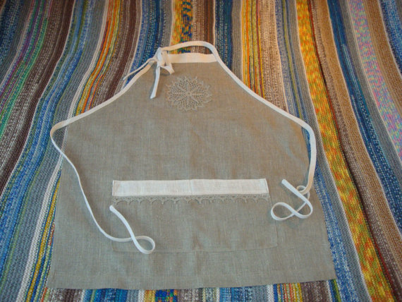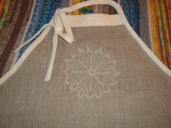 Be the first to review “Apron 100 percent linen, dark with white crochet embroidered trim, two front pockets with crochet lace”