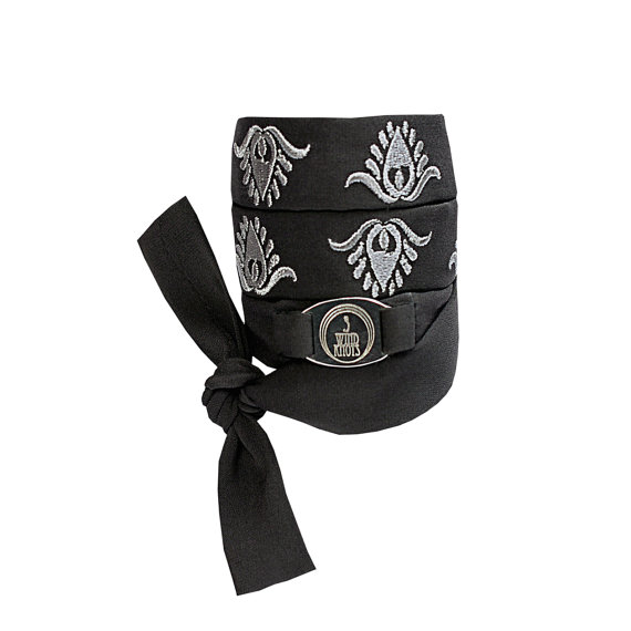 Jewellery is embroidered with Art Nouveau ornament and 3 wind knots metallic logo is stitched on silk braid.