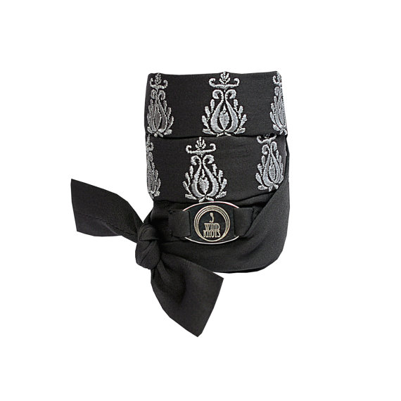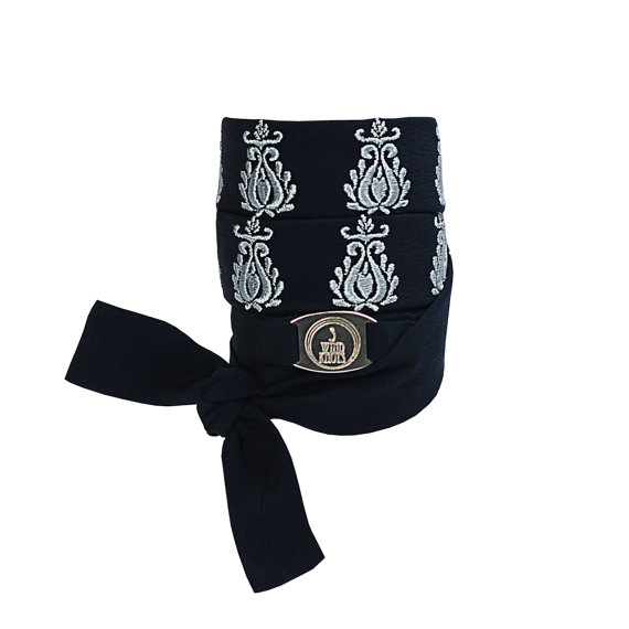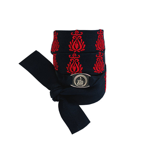 Jewellery is embroidered with Art Nouveau ornament and 3 wind knots metallic logo is stitched on silk braid.
