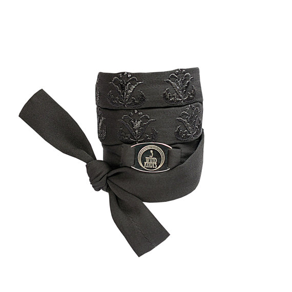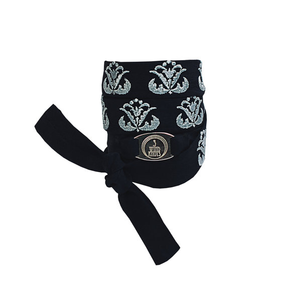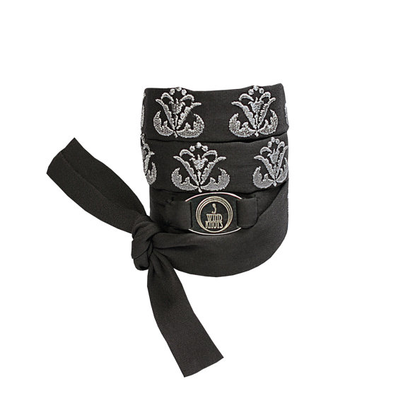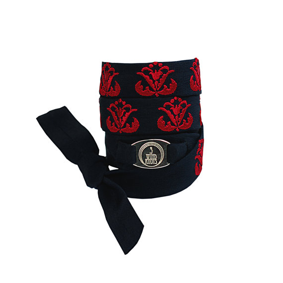 Jewellery is embroidered with Art Nouveau ornament and 3 wind knots metallic logo is stitched on silk braid.