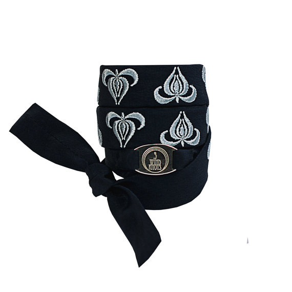 Jewellery is embroidered with Art Nouveau ornament and 3 wind knots metallic logo is stitched on silk braid.