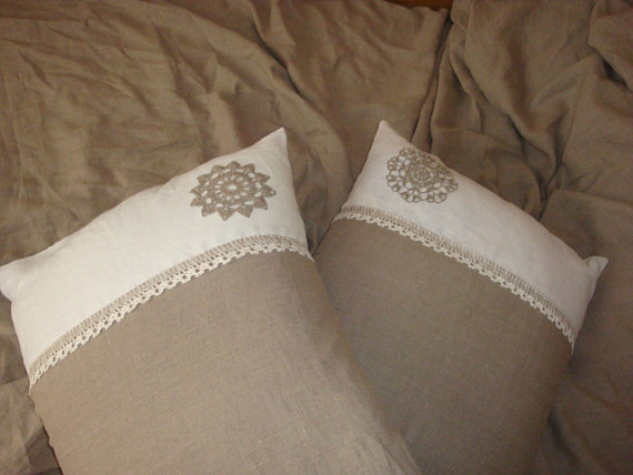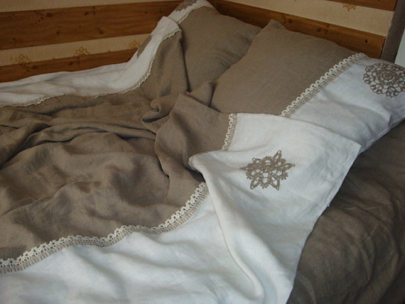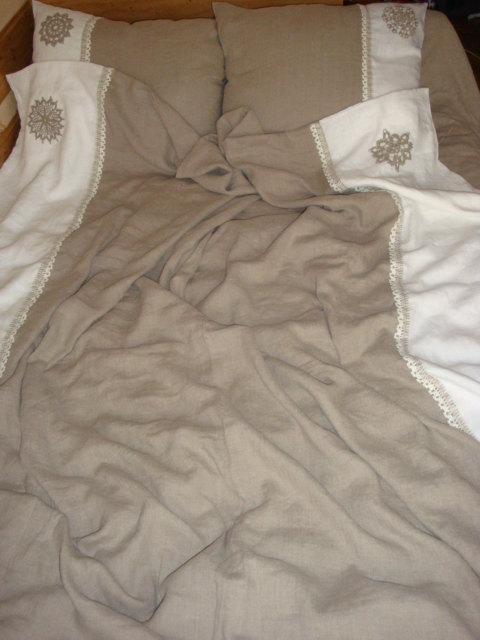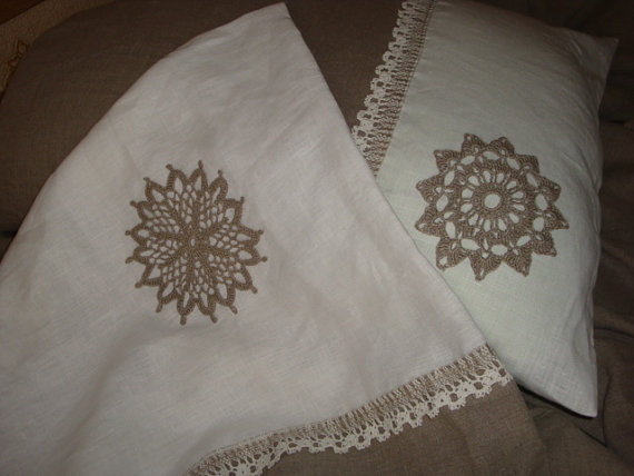 Bed Linen from 100 percent linen. Stitched from naturally gray and white linen. Decorated with crocheted flowers and linen lace. For you!