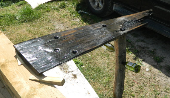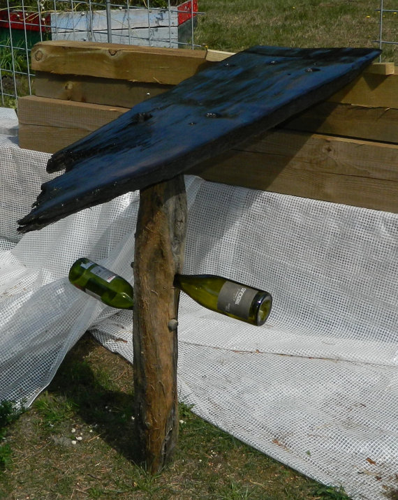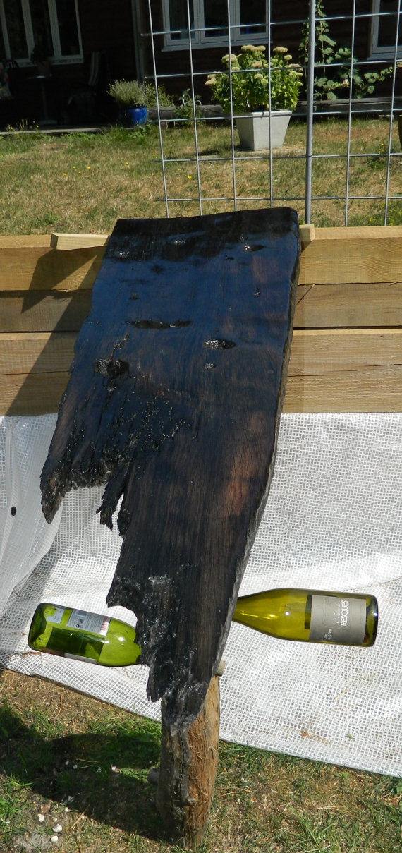 Table wine rack made of plank from very old ship. the oak has been so long in the water that the tannins have made it black. bog oak.