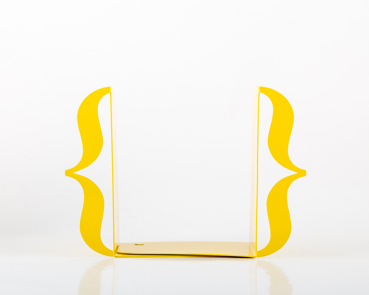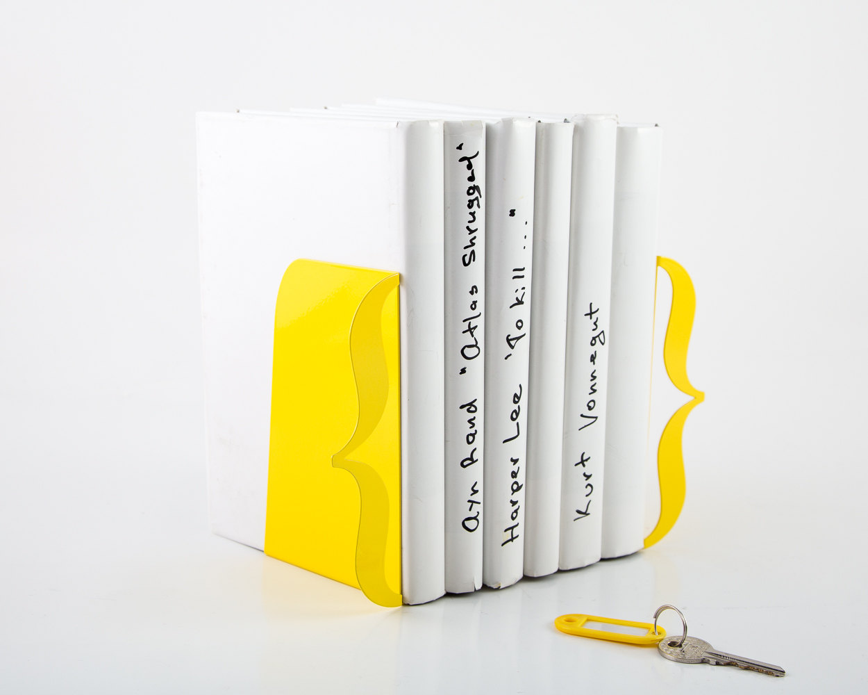 Stricking yellow color bookends. Clean shapes A weekly or monthly portion of books for you to read in between them. You’ll never loose it on the shelf. All you guests will notice it. Functional and beautiful! No more no less.
