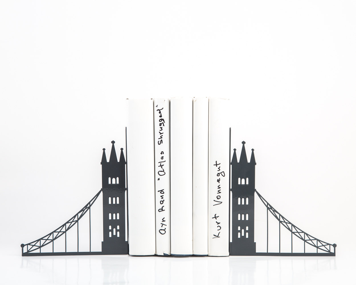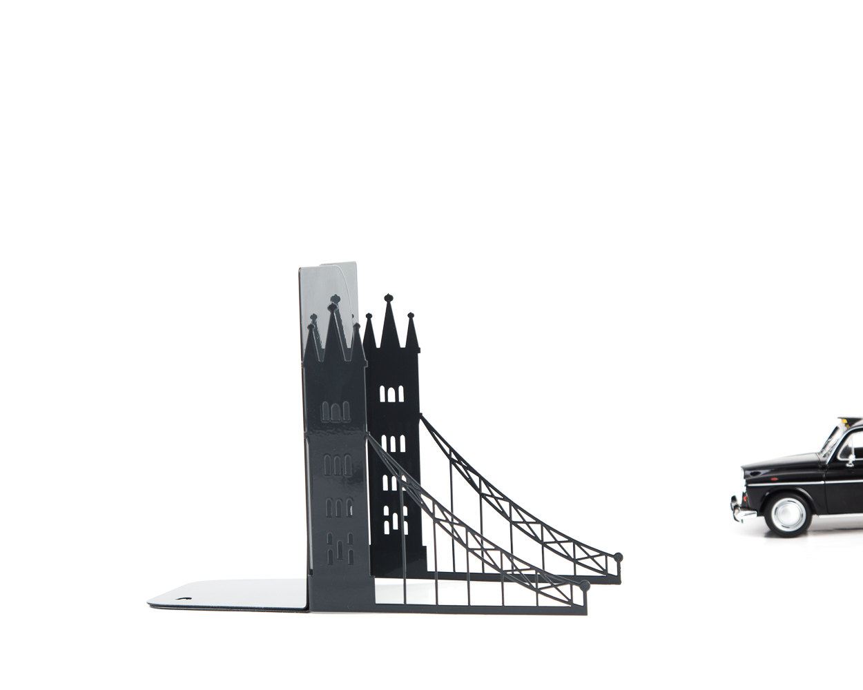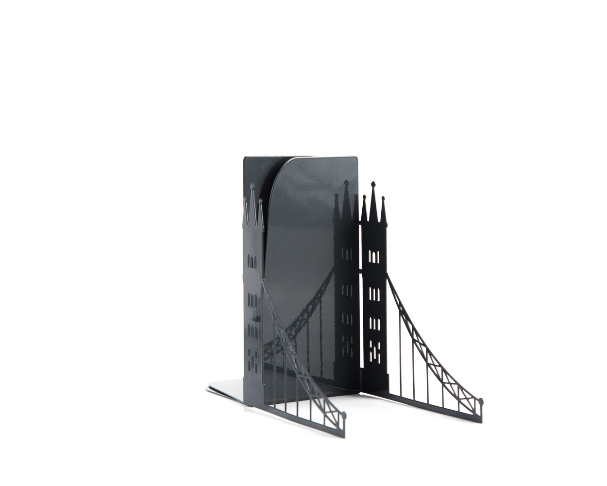 Powder coated laser cut metal. One piece measures approximately 5″9 by 4″3 with a bookend measuring 4″72 in (15 by 11 by 12 cm). Gray glossy powder coating. Sold by a pair only.