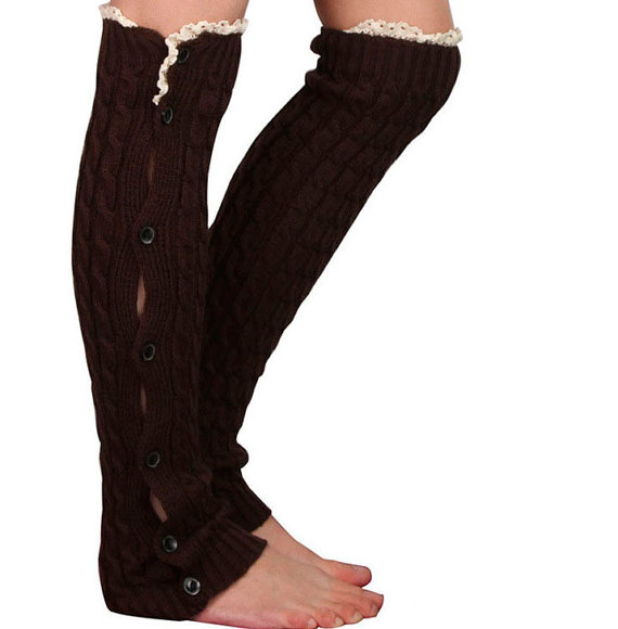 Brown leggings, lace openwork pattern and buttons, knitting, black chocolate