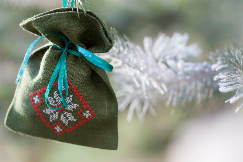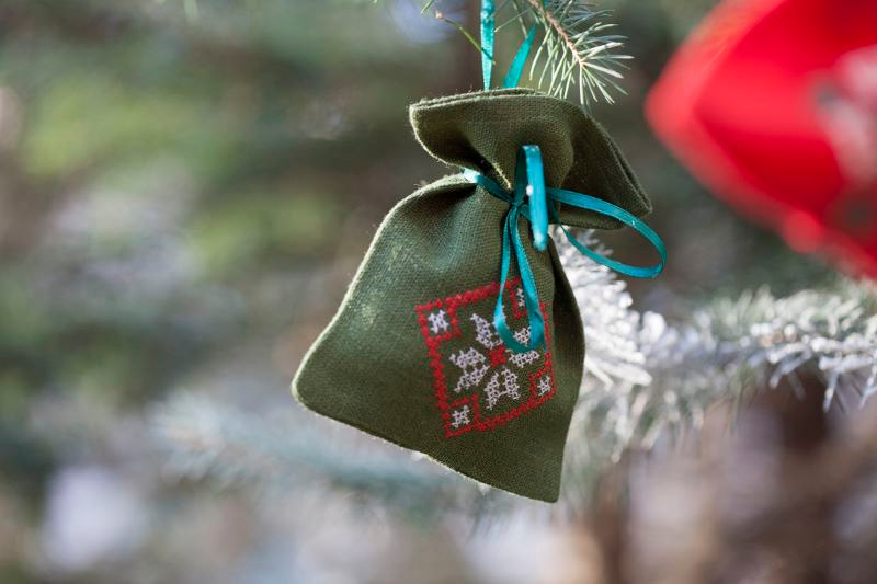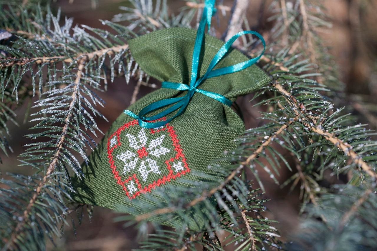 Christmas bag Christmas Mini gift bag with cross stich Latvian etnographic signs embroidery, Christmas Green linen gift wrap, set of 5