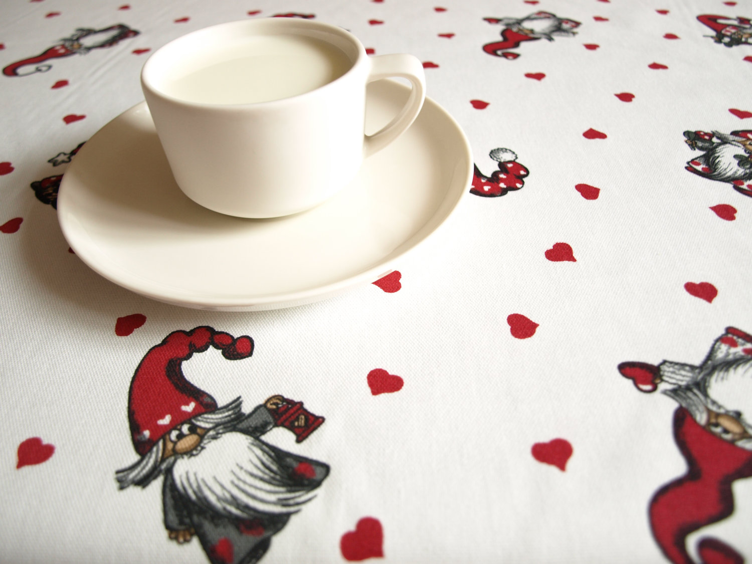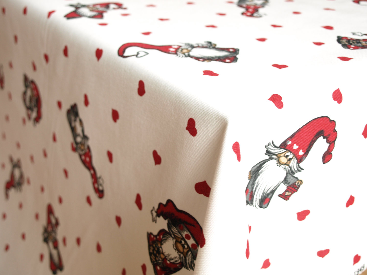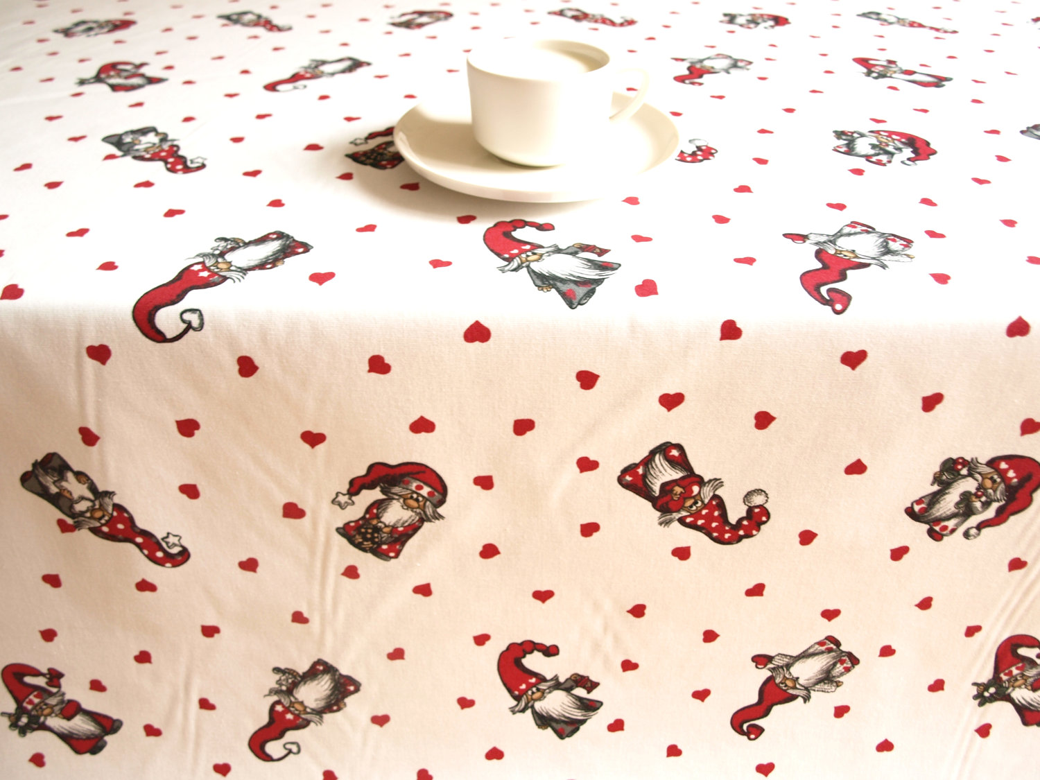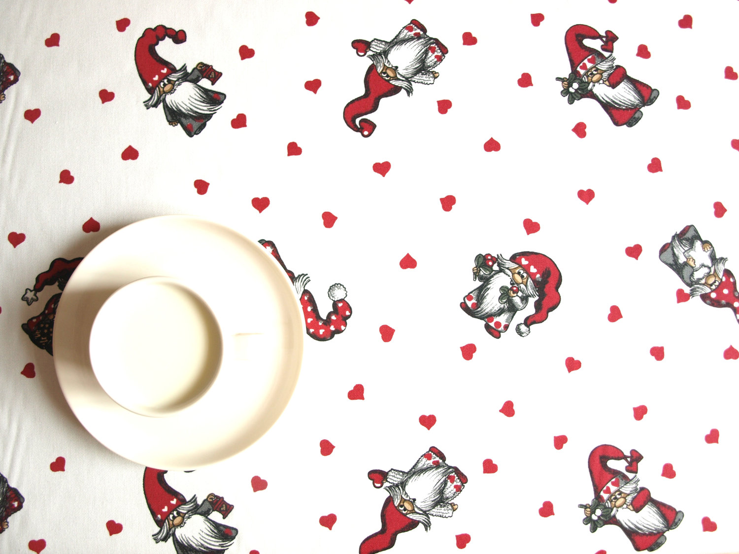 Christmas tablecloth Tomte Elf white gnomes red hearts Holiday decor , napkins , runner , pillow cover , curtains available, great GIFT