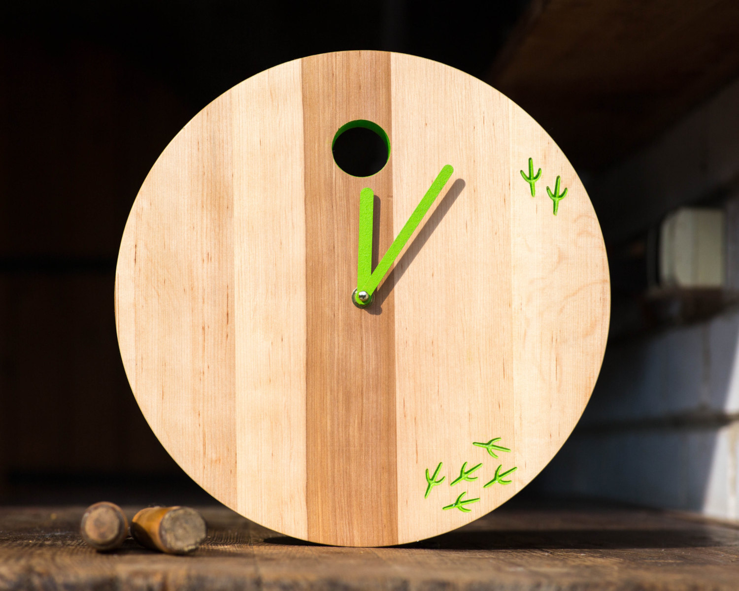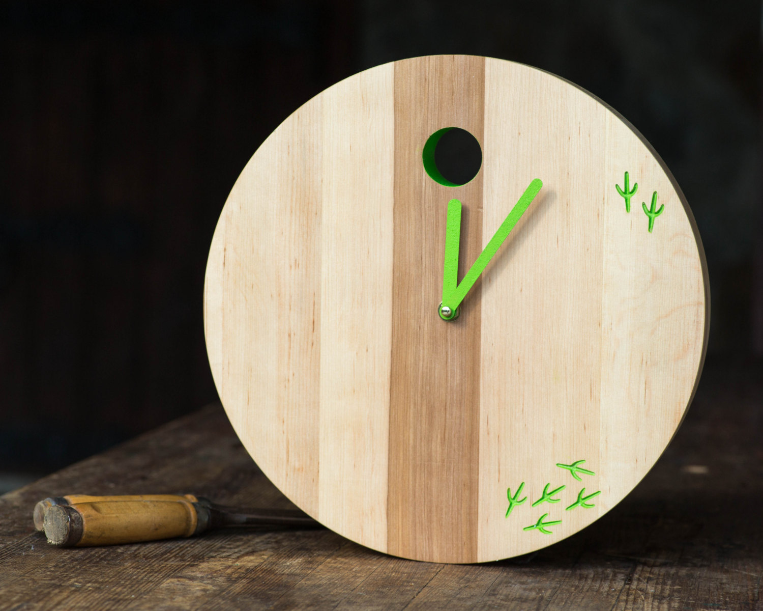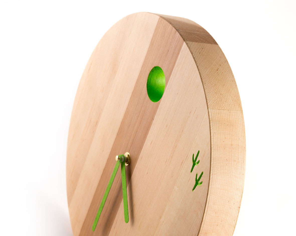 Ironical look at the traditional cuckoo clock. The bird has left. Solid wood. Machine carved, hand tinted and covered by natural wax to seal the beauty of natural wood.
