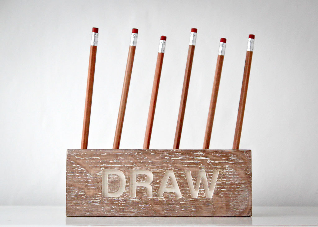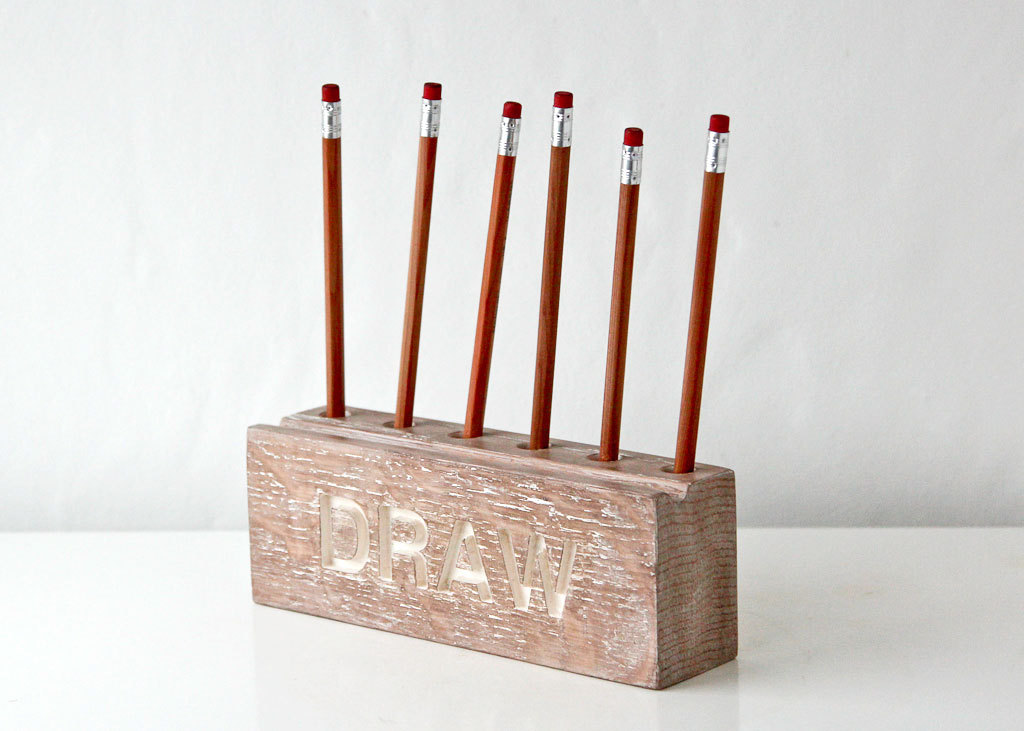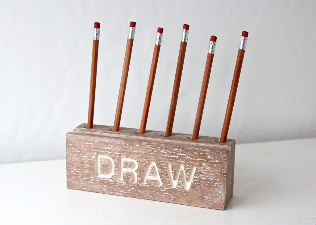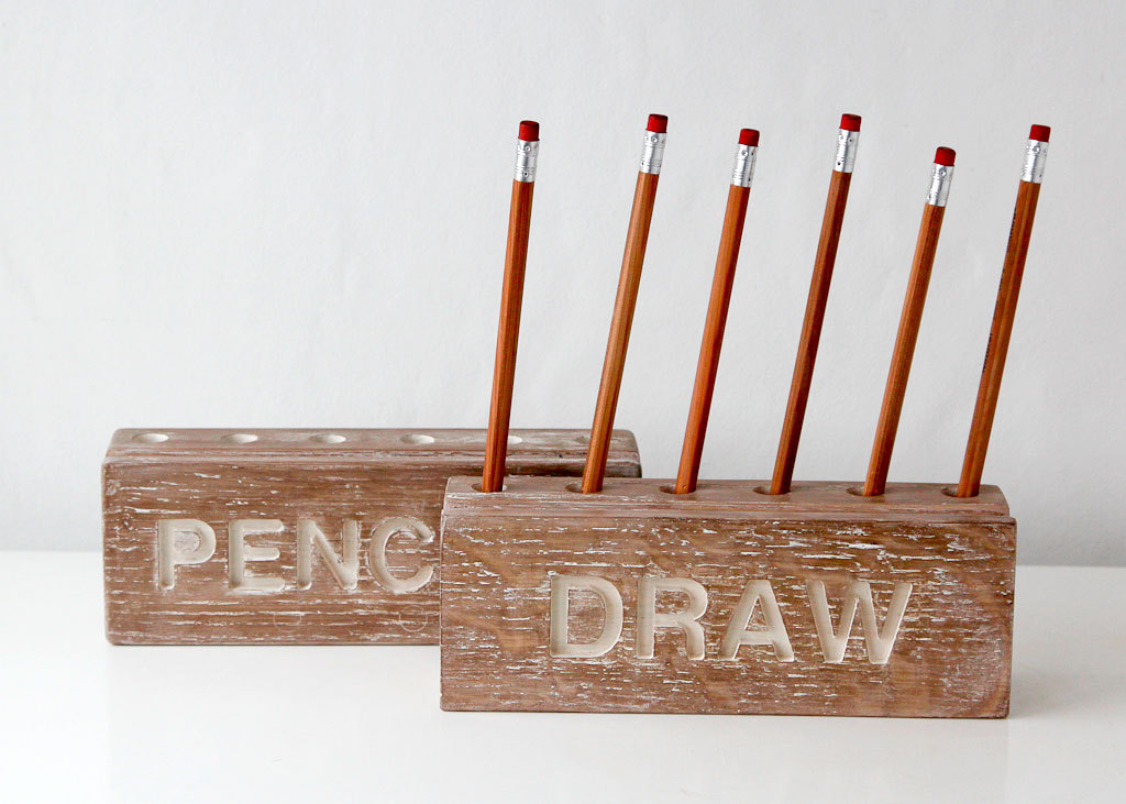 Piece of salvaged solid oak to hold your pencils. Holds 6 items. Has a horizontal groove to put something in. Solid oak with carved in letters. Hand painted and distressed to get this trendy shabby look. Would look great on a stylish desk!