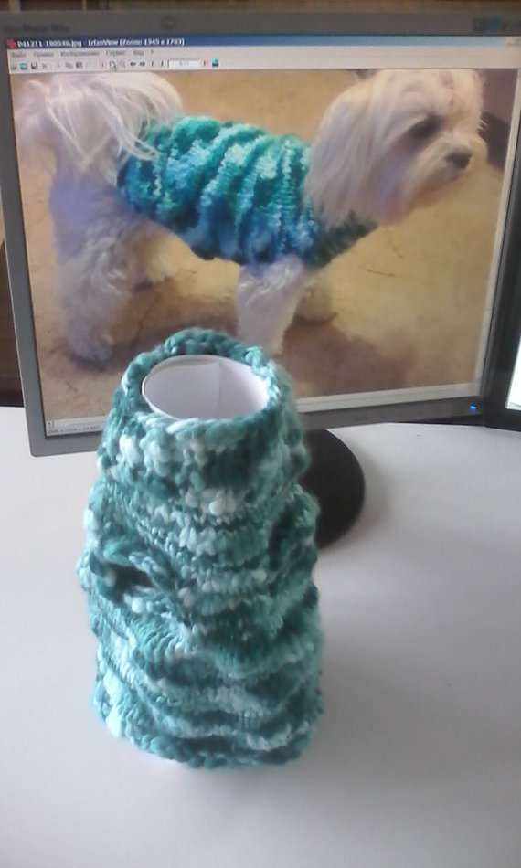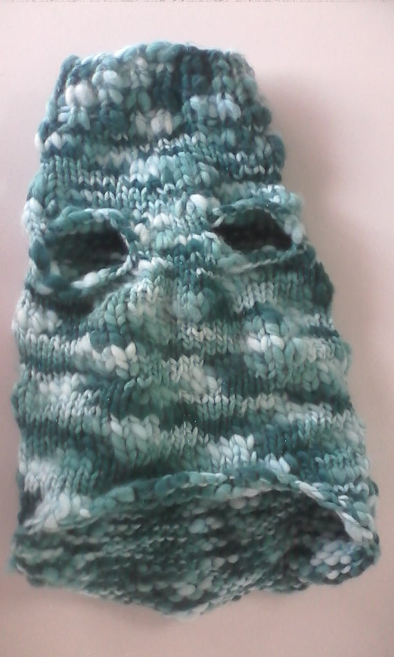 The cute dog sweater is hand knitted in a chunky knit melange green yarn ensuring comfort