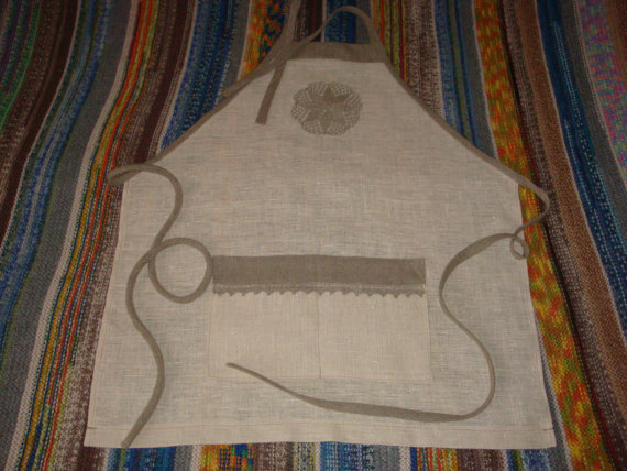 FREE SHIPPING. Apron 100 percent linen, white with dark crochet embroidered trim, two front pockets with crochet lace