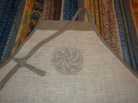 Be the first to review “FREE SHIPPING. Apron 100 percent linen, white with dark crochet embroidered trim, two front pockets with crochet lace”