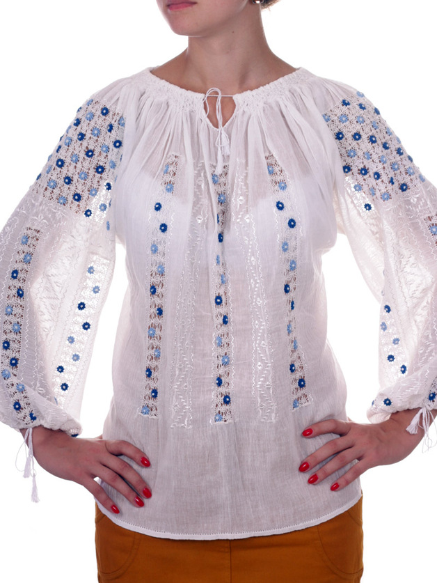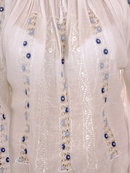 Complex and rich geometric embroidery stitch is made, white silk threads, batiste.