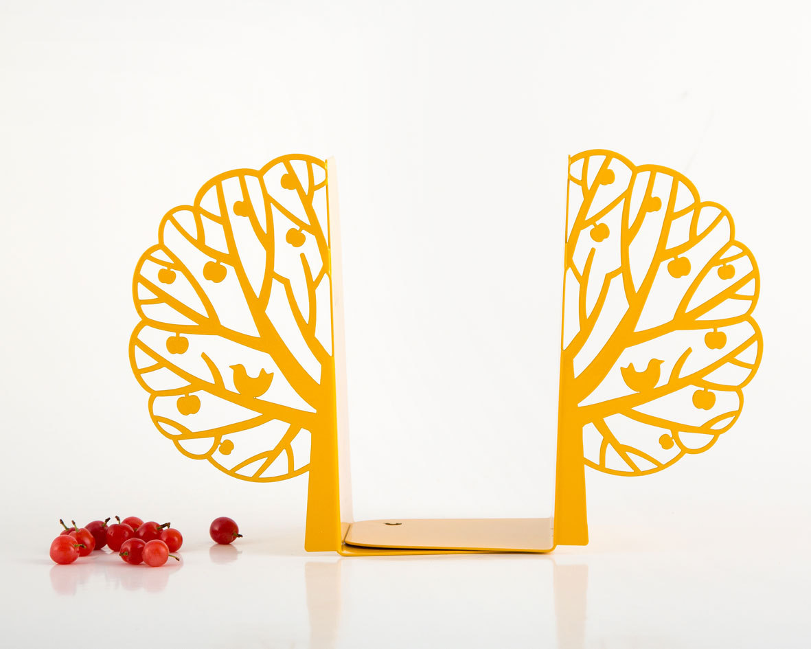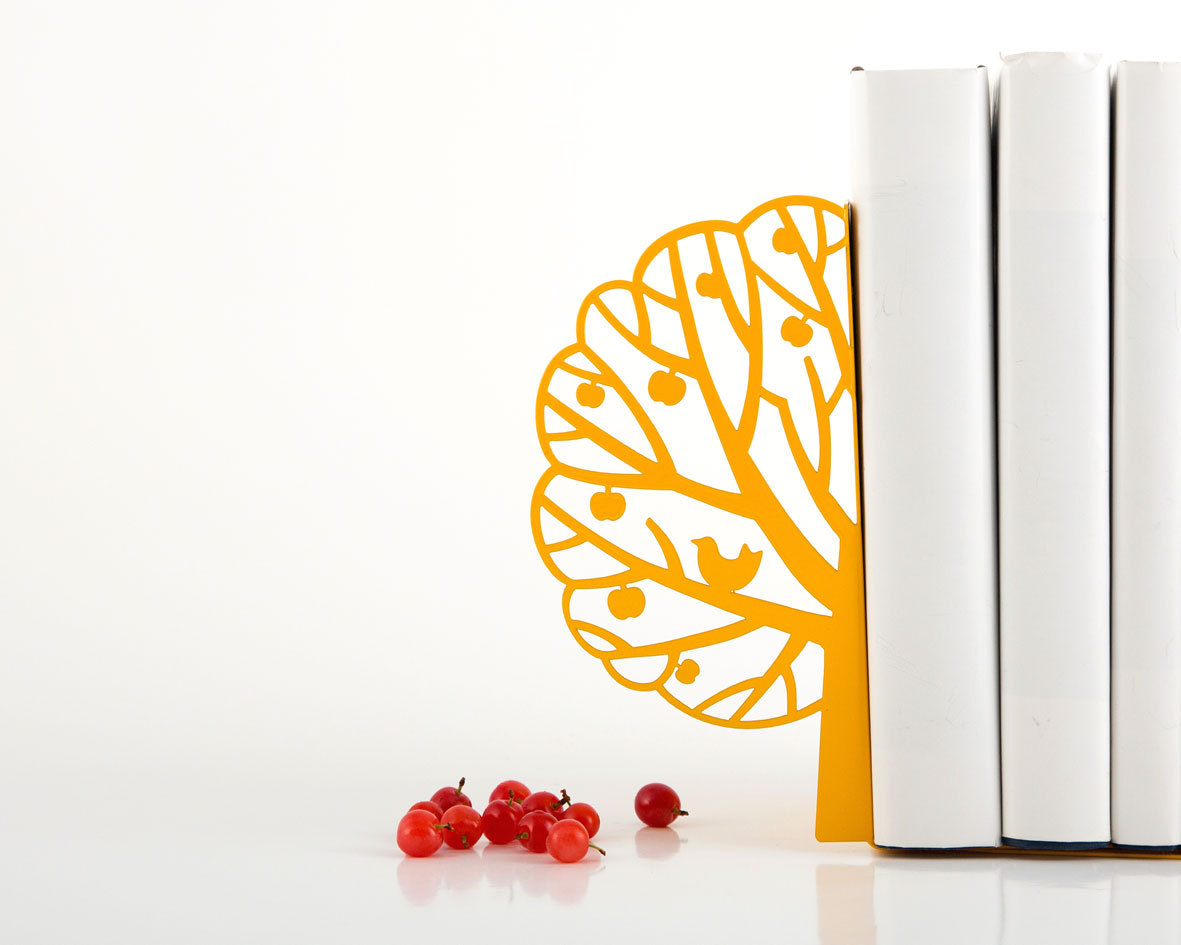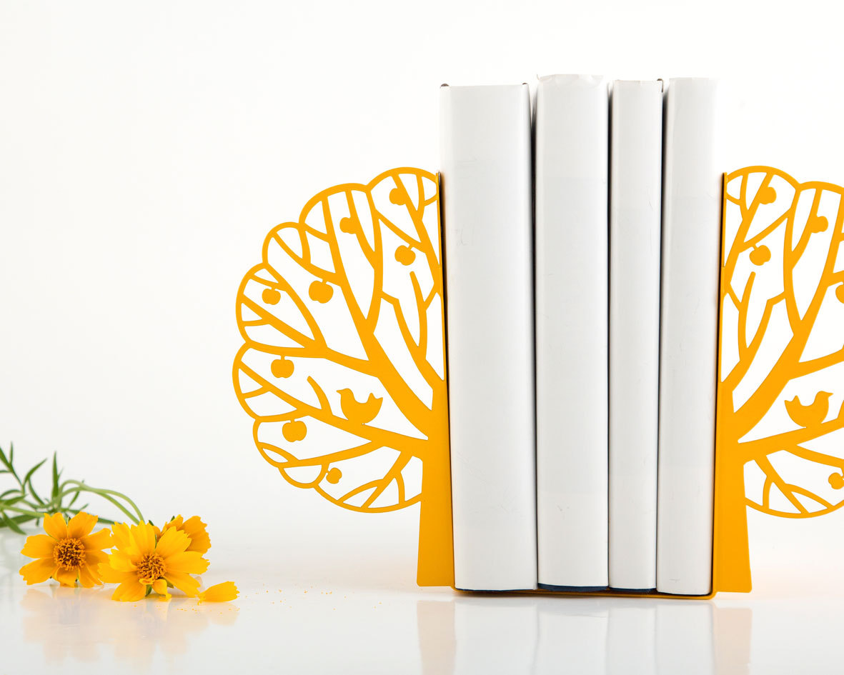 Love and Scandinavian inspired design. Magnificent combination. Tree full of leaves with a bird on its branch. Powder coated laser cut metal bookends.