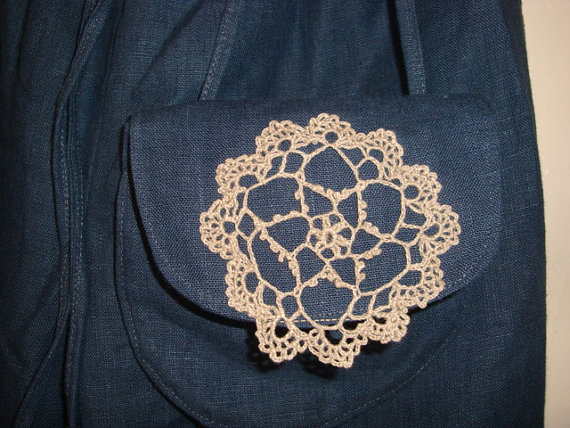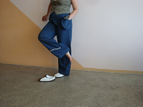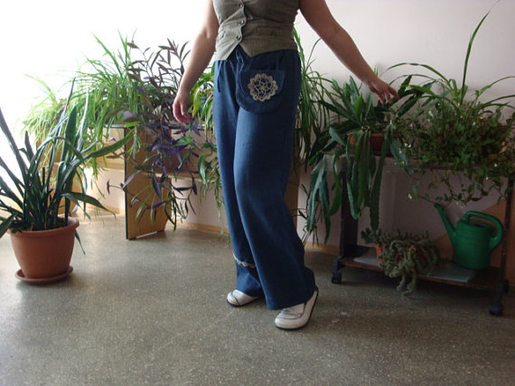Pants from 100 percent linen fabric. Convenient model; with crochet details. Marine blue, wears will become more beautiful.