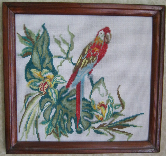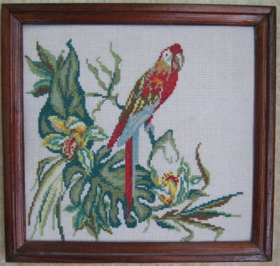 parrot Ara – bird parrot – cross – stitch embroidery picture – Wall Picture – hand embroidery – large striking parrot with long tail