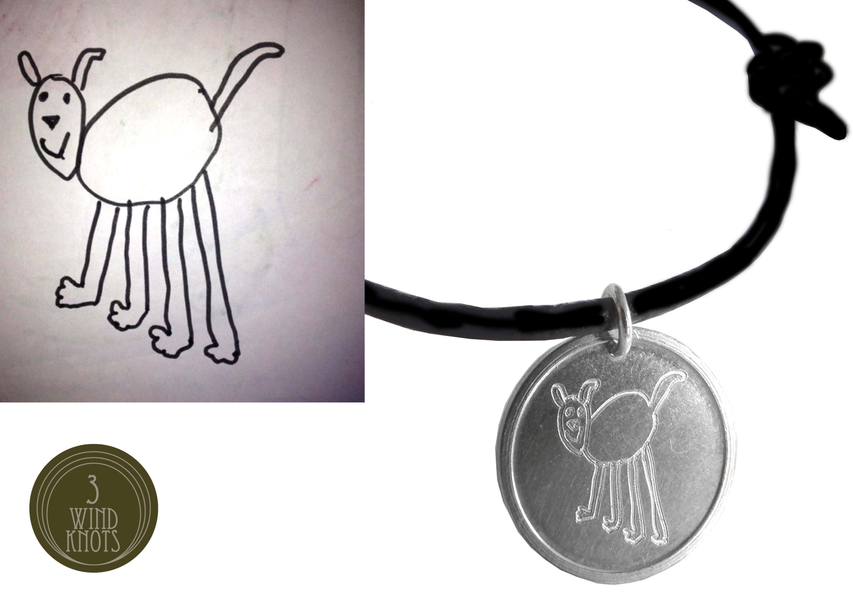 Kid’s drawing is engraved on the front size, logo and kids name or left side of the pendant. Leather cord: 35 or 75cm. Sterling silver 925 pendant, diameter 1.5cm. Contact us for personalization of your drawing! ** design by Jasmine (5 years)
