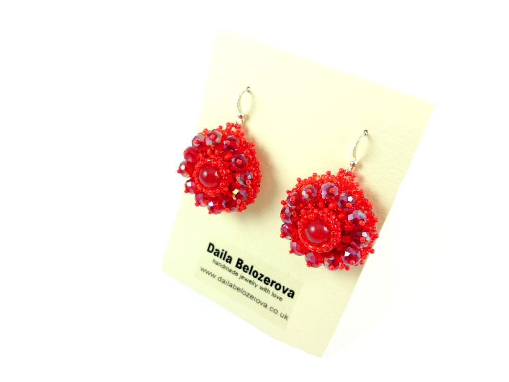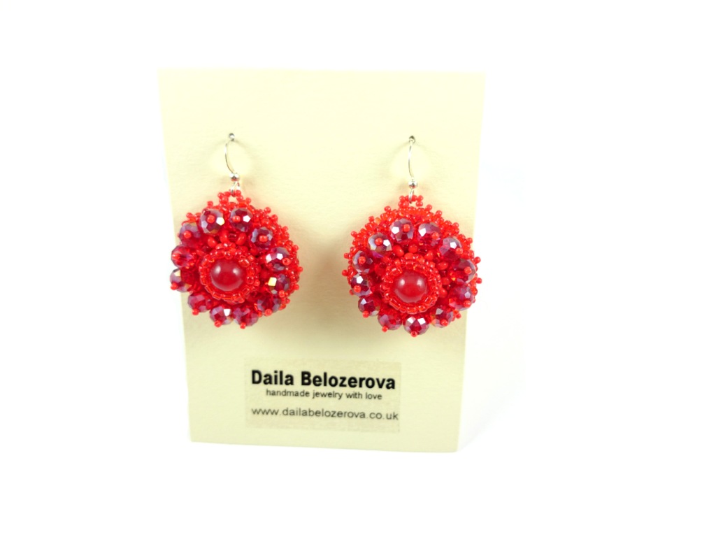 Red Jade Earrings. Bead Embroidered Earrings, Jewelry in bead embroidery, Red Handmade earrings.