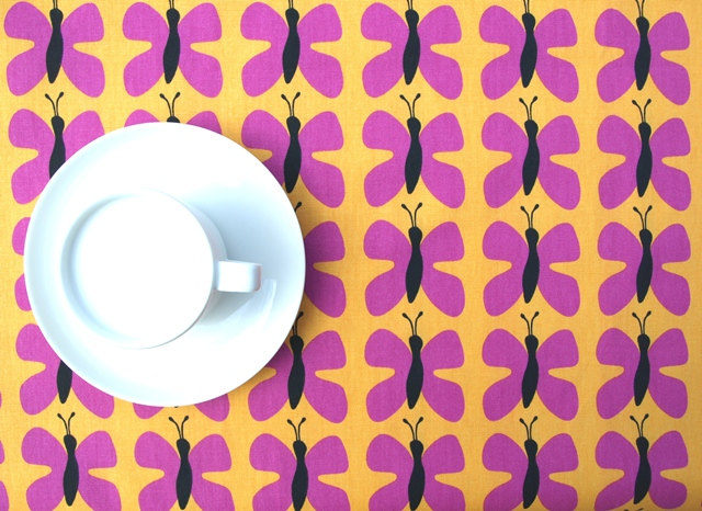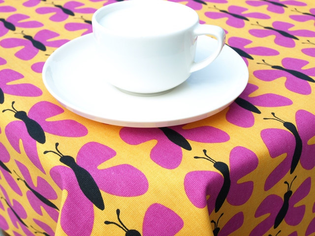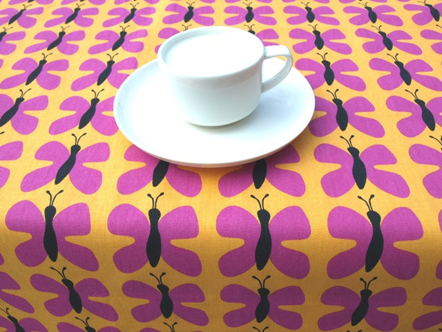 Tablecloth bright yellow orange black purple butterflies , table runner , napkins , pillow , curtain available, great GIFT
