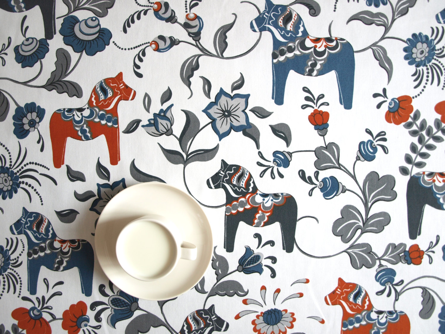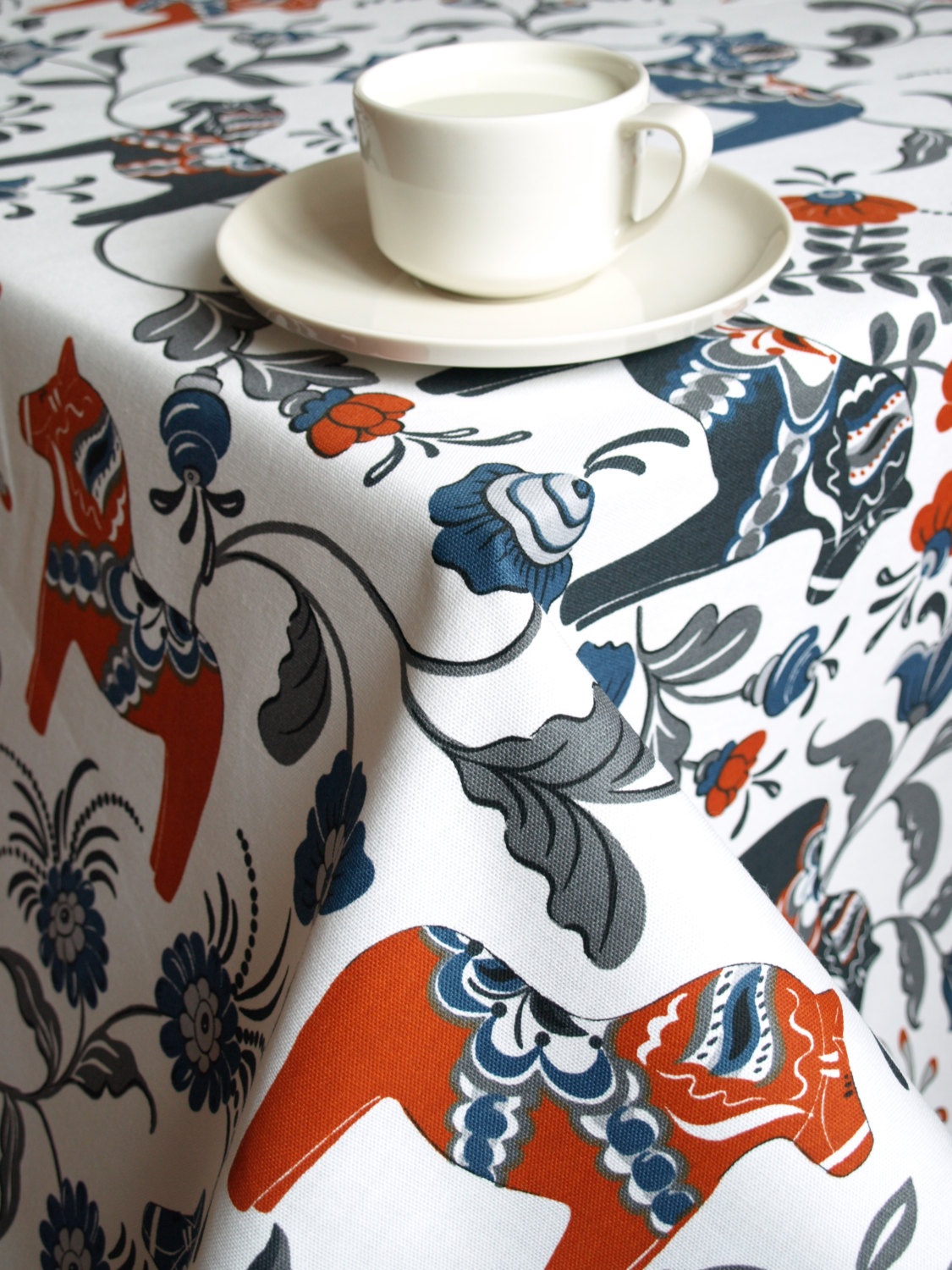Tablecloth Dala Horses white orange blue grey Scandinavian Design , also napkins, table runner available, great GIFT