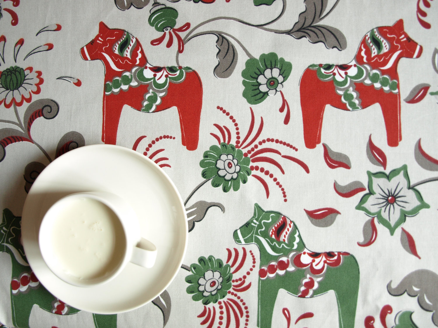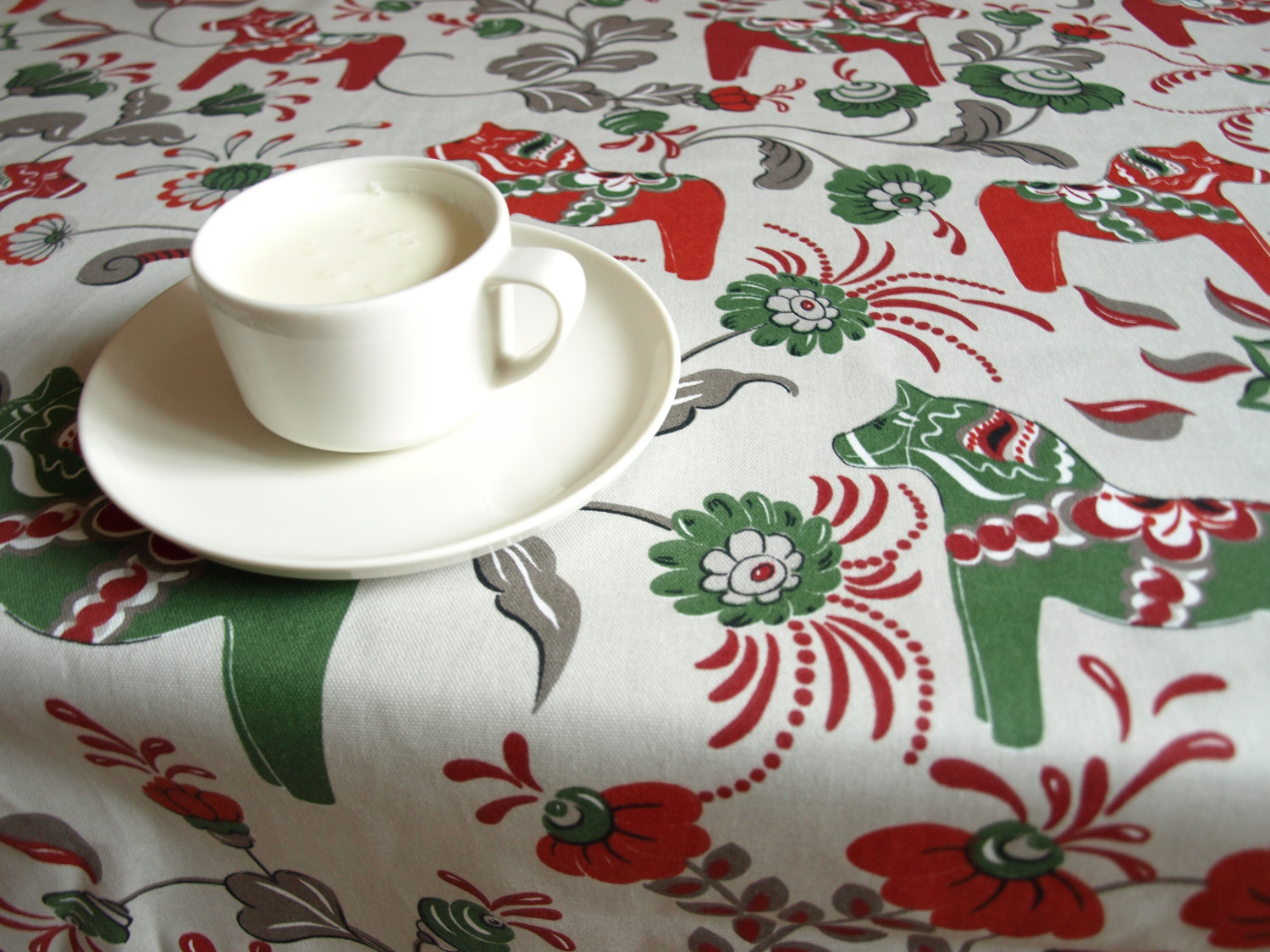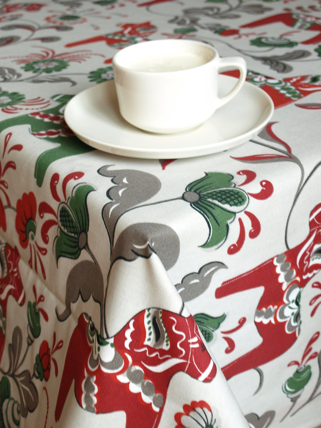 Tablecloth grey beigr green red Swedish Dala horses Scandinavian Design , napkins , runner , pillow covers , curtains available, great GIFT