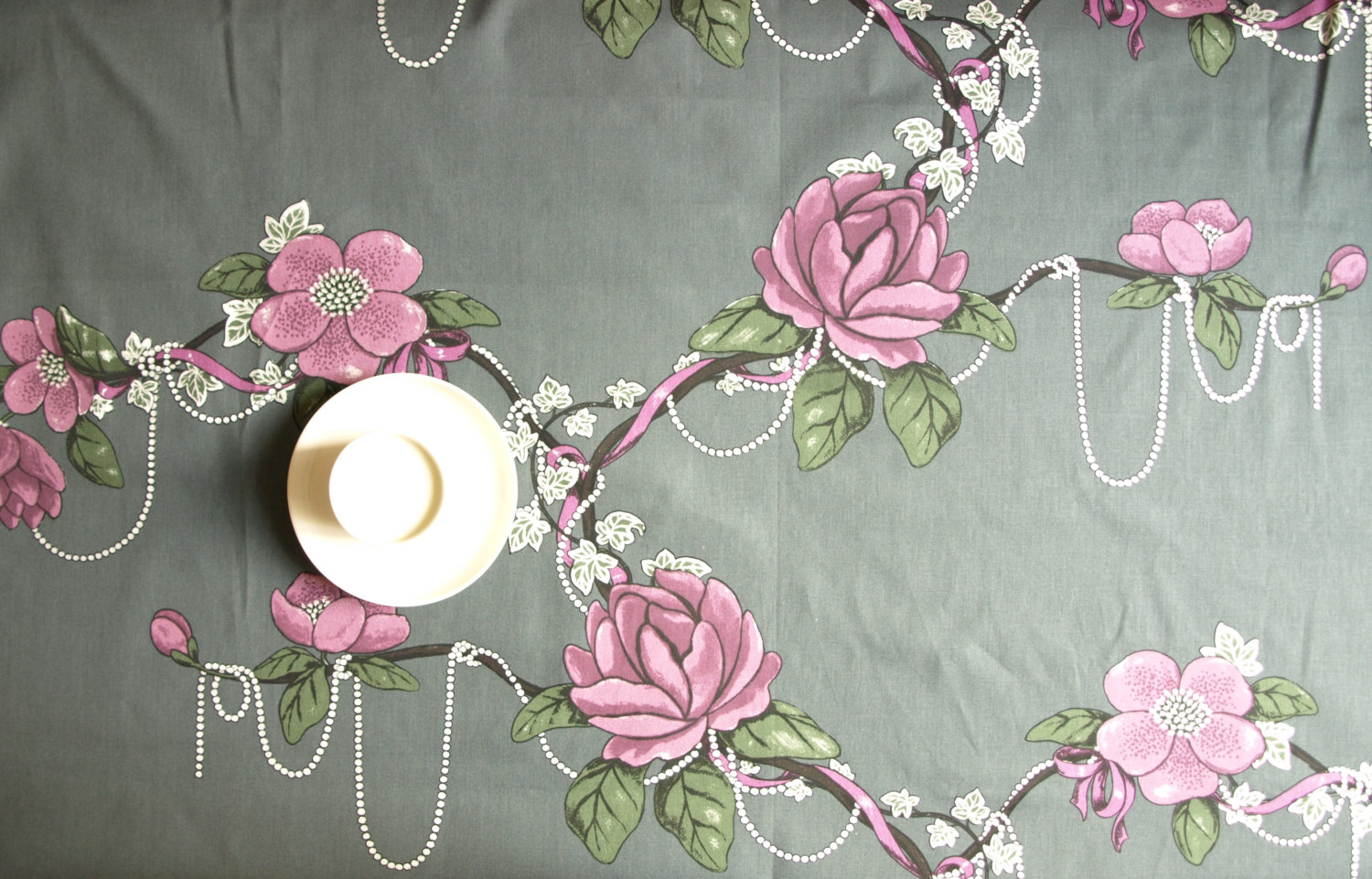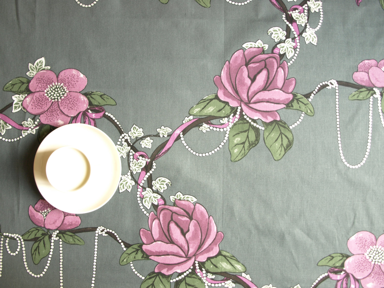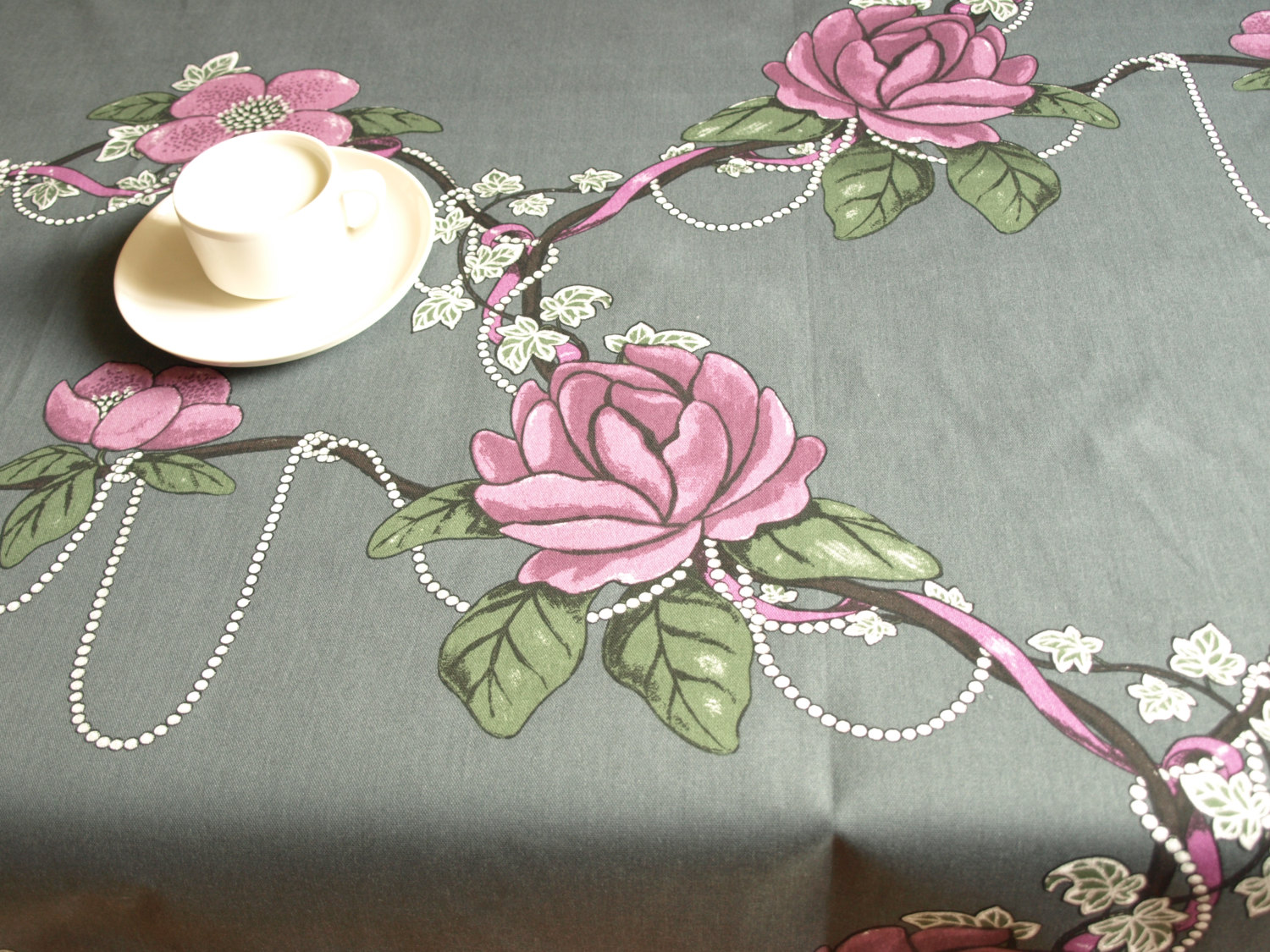 Tablecloth grey purple Roses green leaves pearls Floral Scandinavian Design , runner , napkins , curtains , pillows available, great GIFT