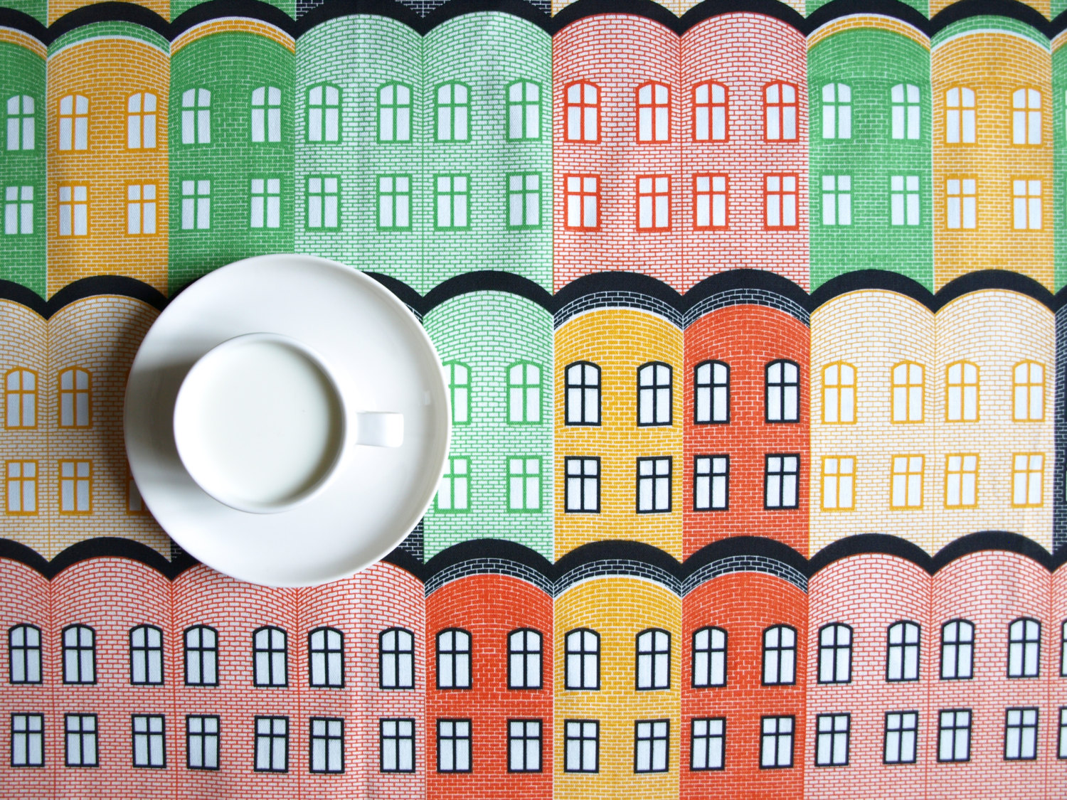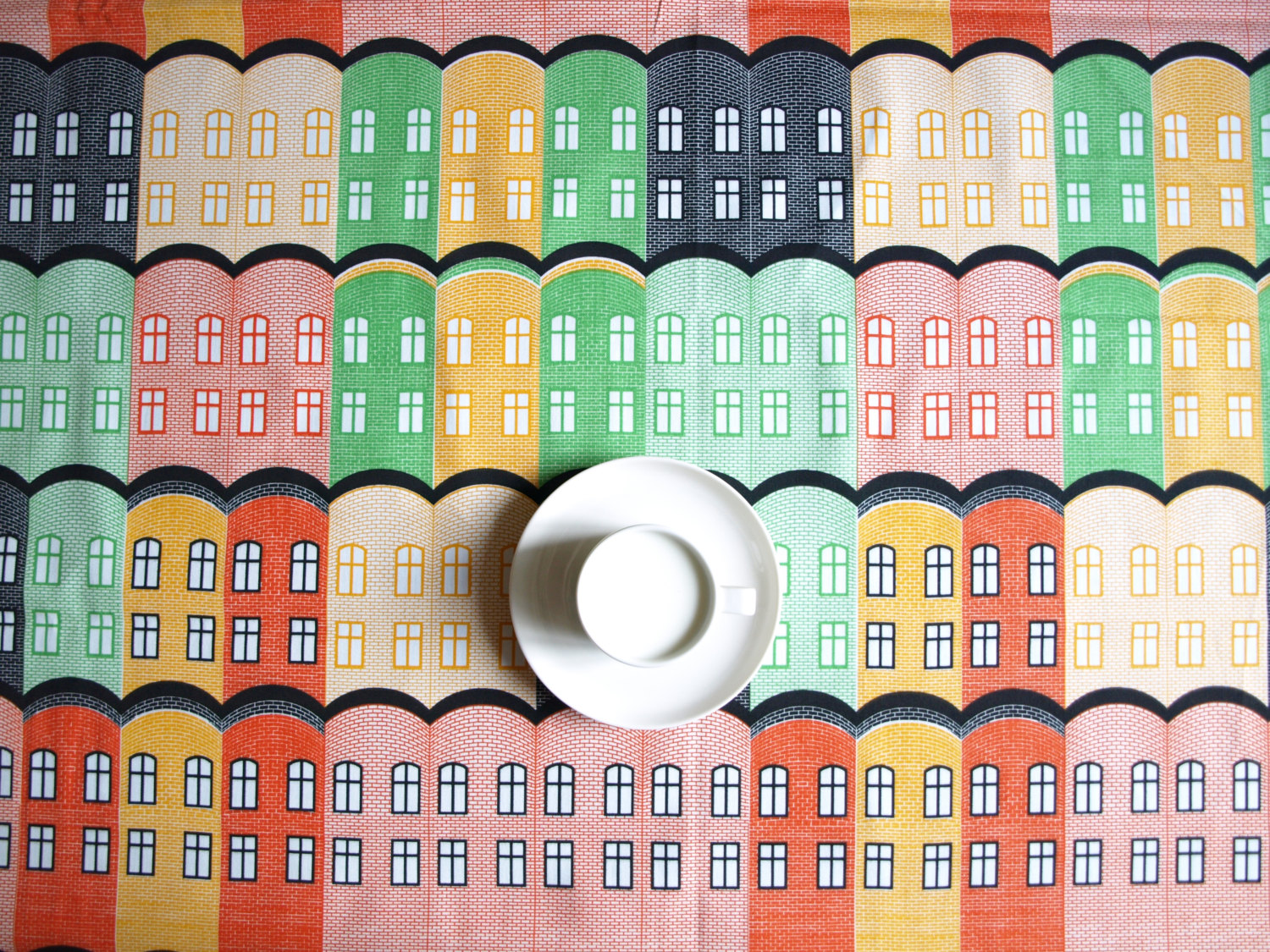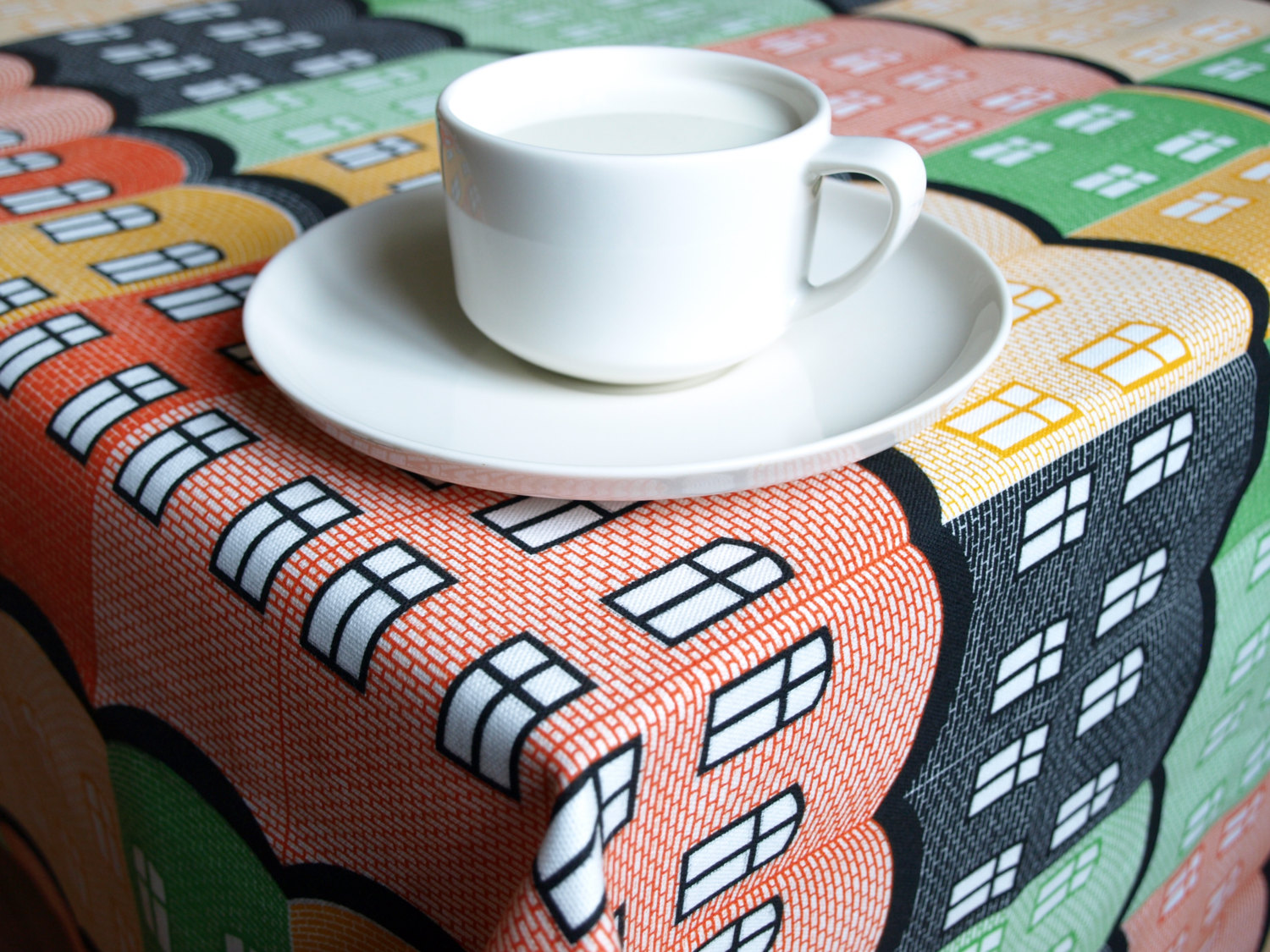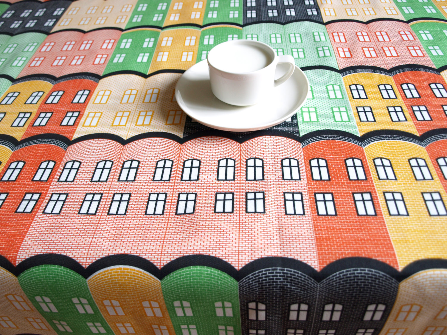 Tablecloth red green black yellow orange Houses Modern Scandinavian Design , runner , napkins , pillow , curtains available, great GIFT