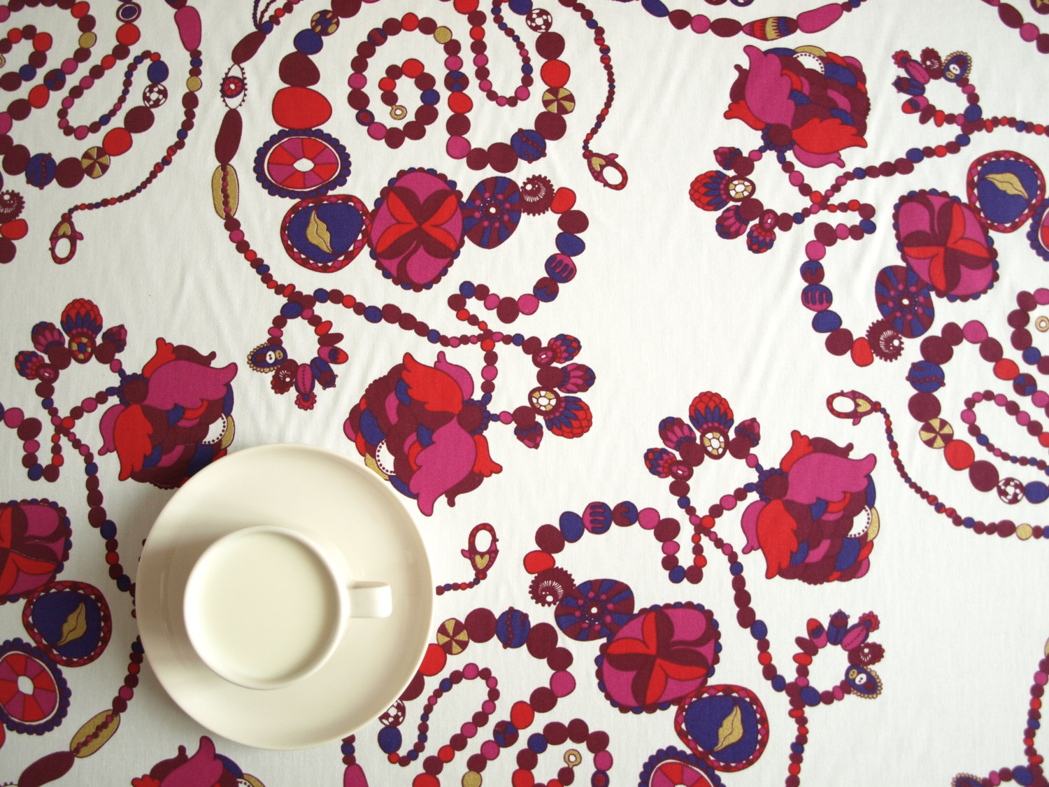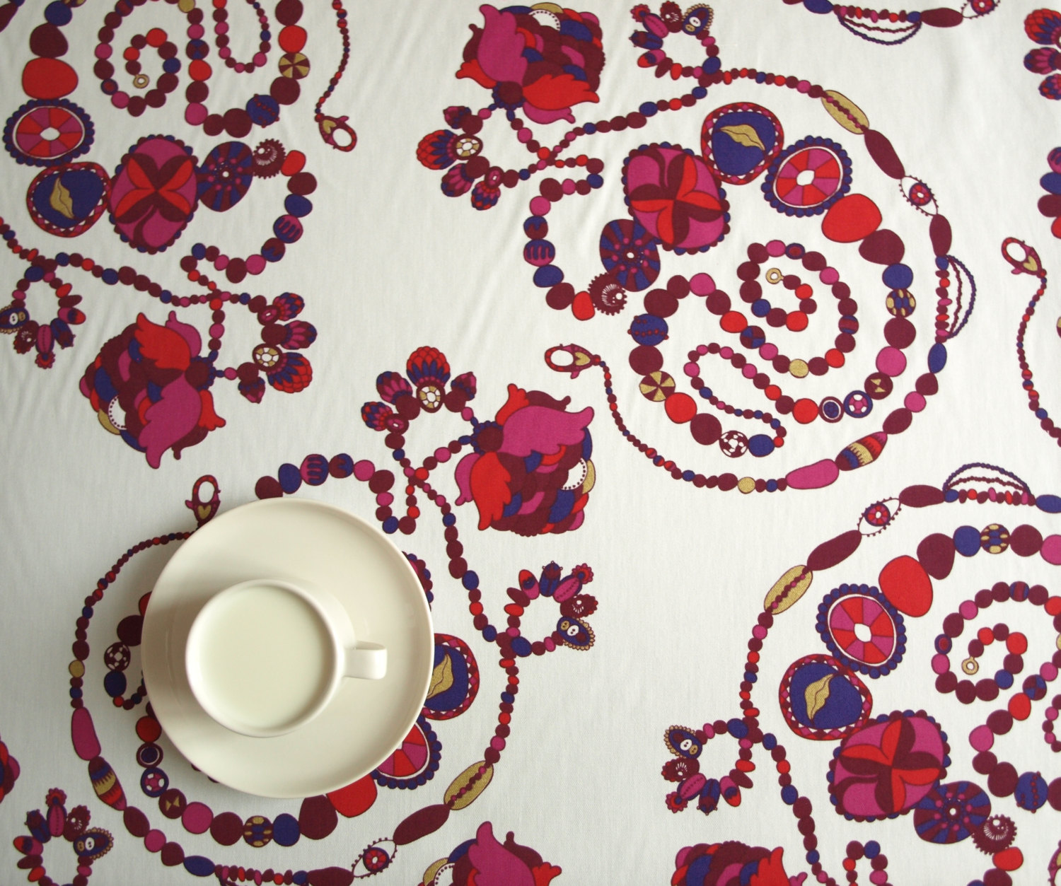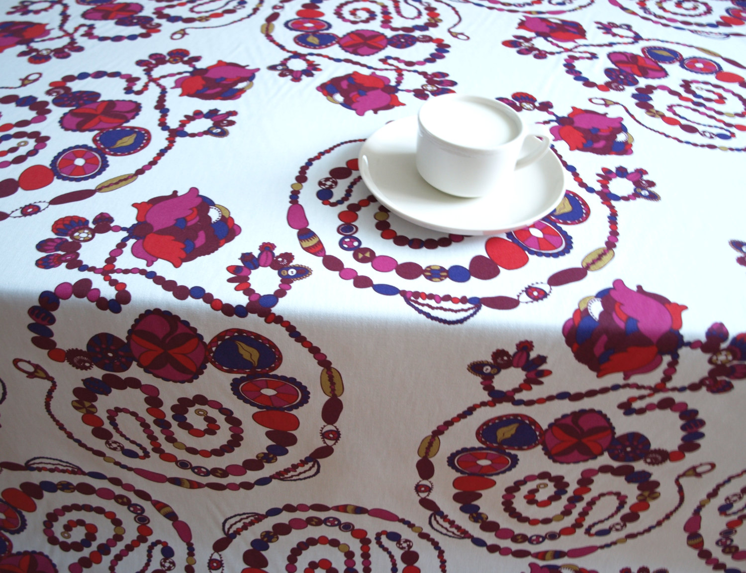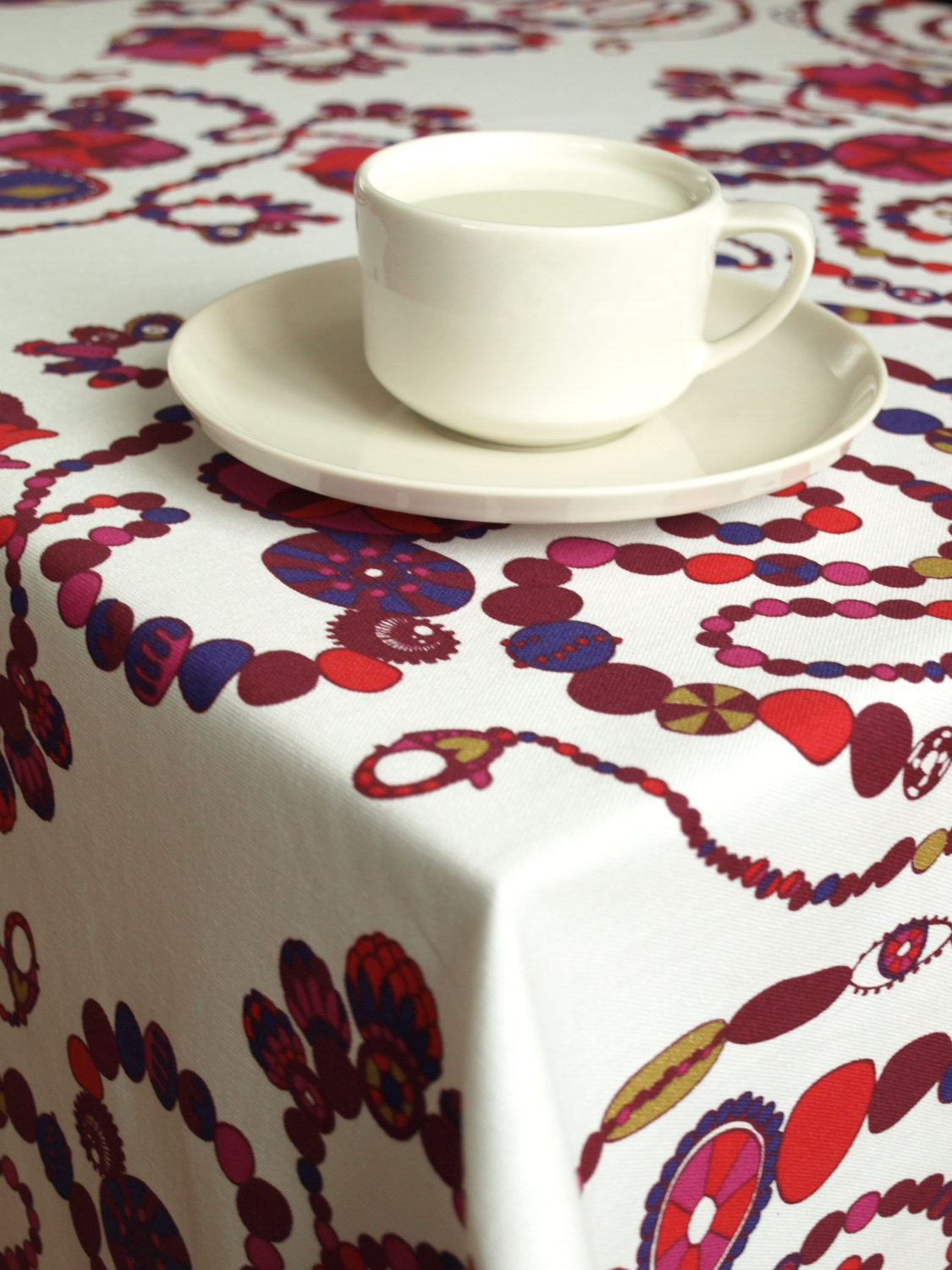Be the first to review “Tablecloth white abstract beads pink red jewelry 37″x37″ or made to order your size, napkins , table runner , curtains available, great GIFT”