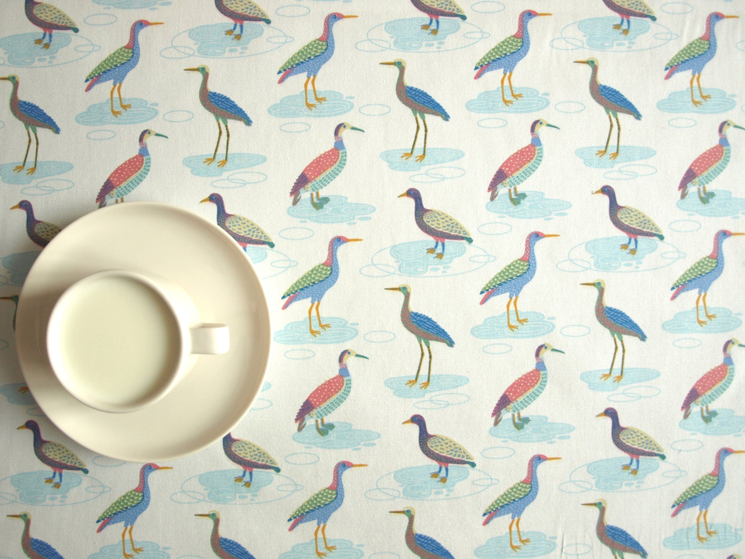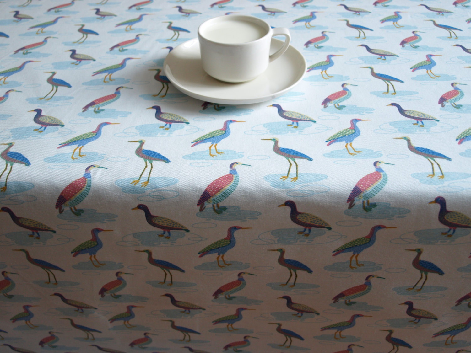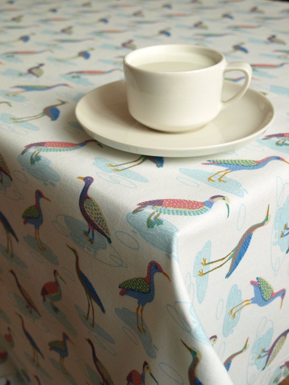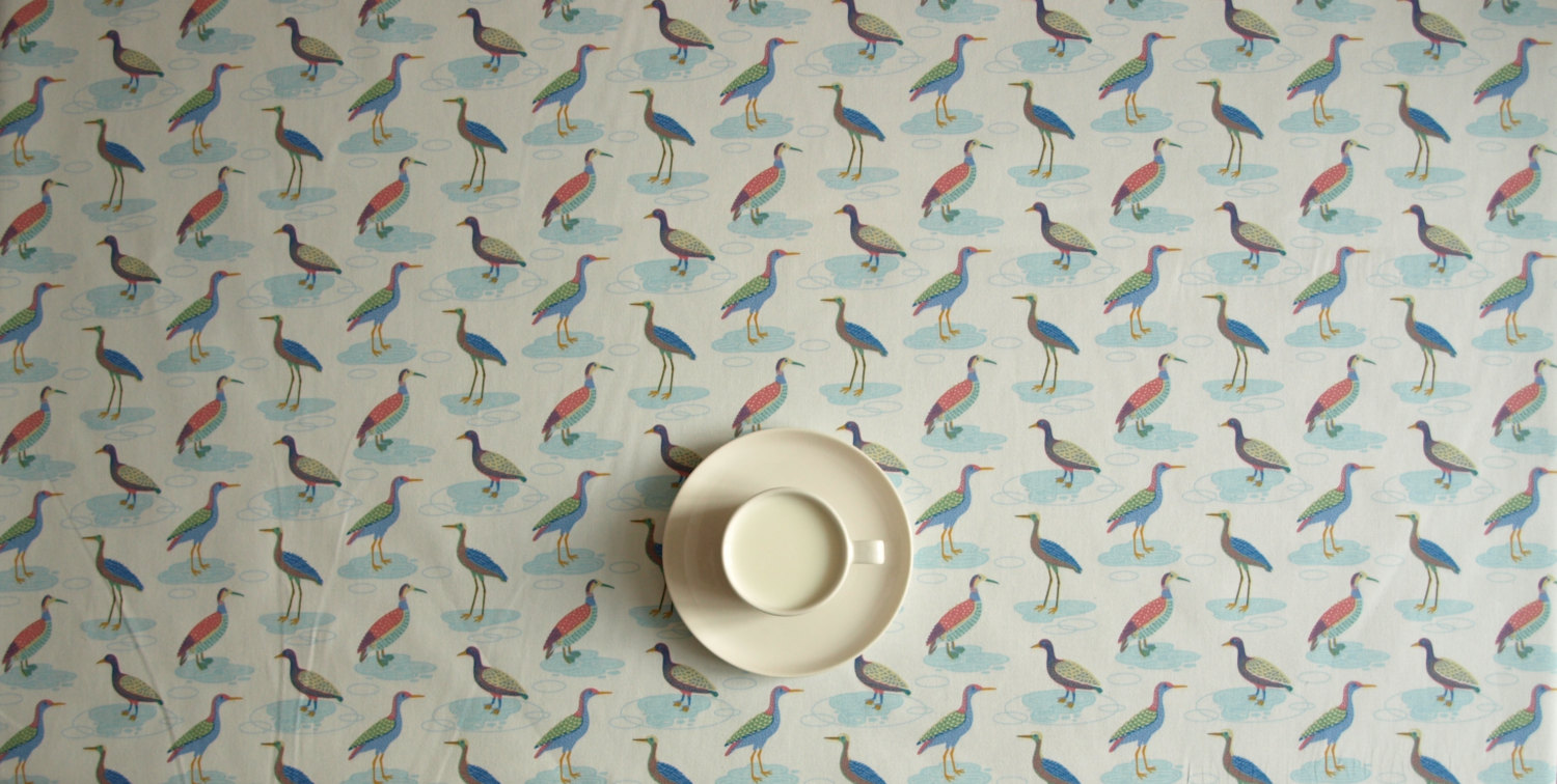 Tablecloth white colorful small birds , also napkins runner curtains pillows available, great GIFT