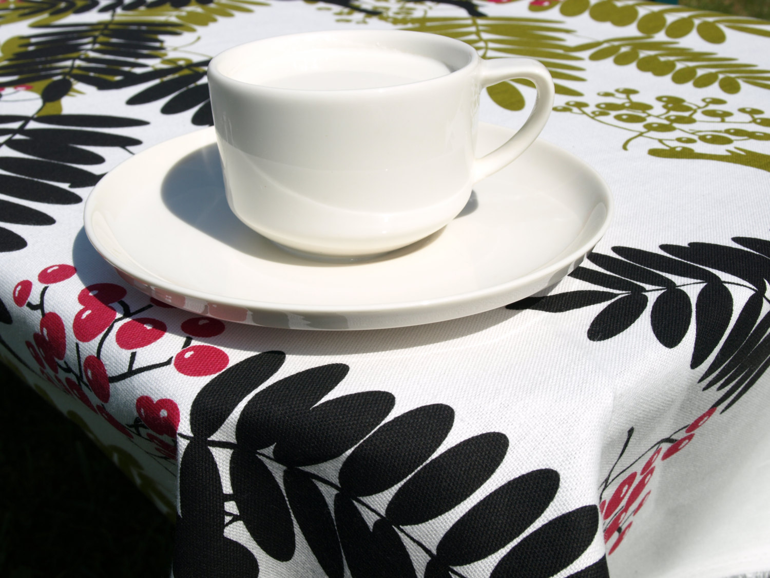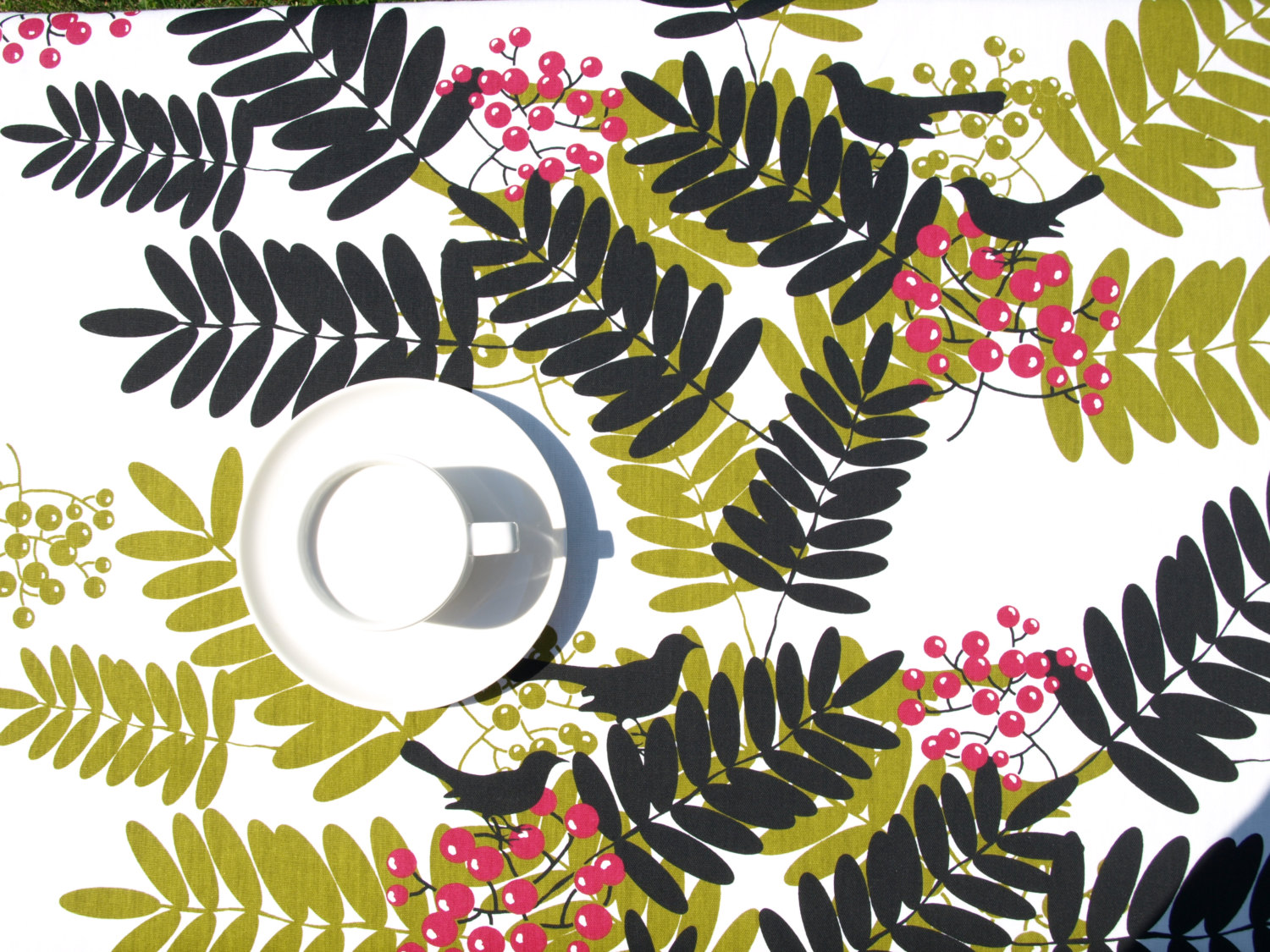 Tablecloth white green black leaves birds red berries Modern Scandinavian Design , runner , napkins , pillow , curtains available,great GIFT