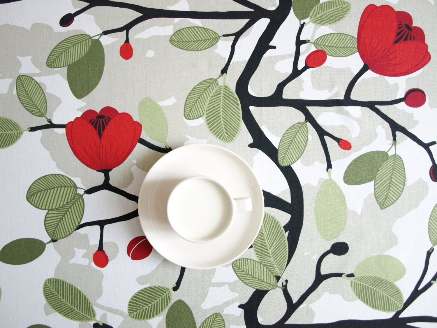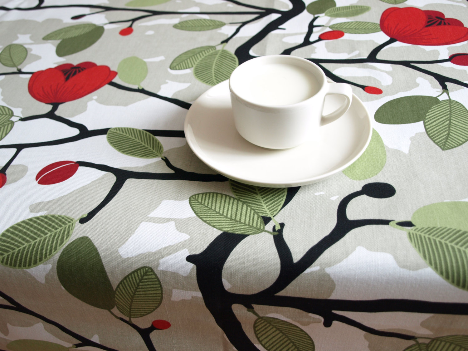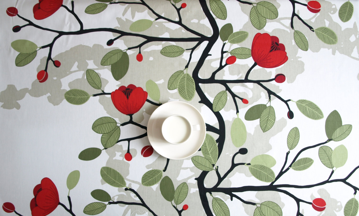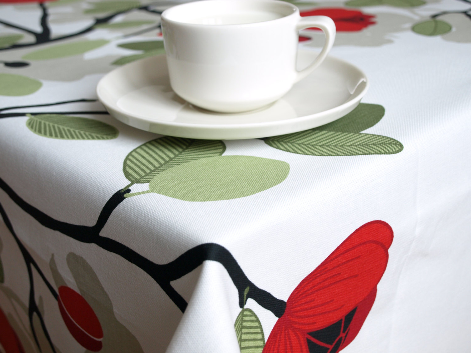 Tablecloth white green leaves red flower black tree Floral Scandinavian Design , runner , napkins , curtains , pillows available, great GIFT