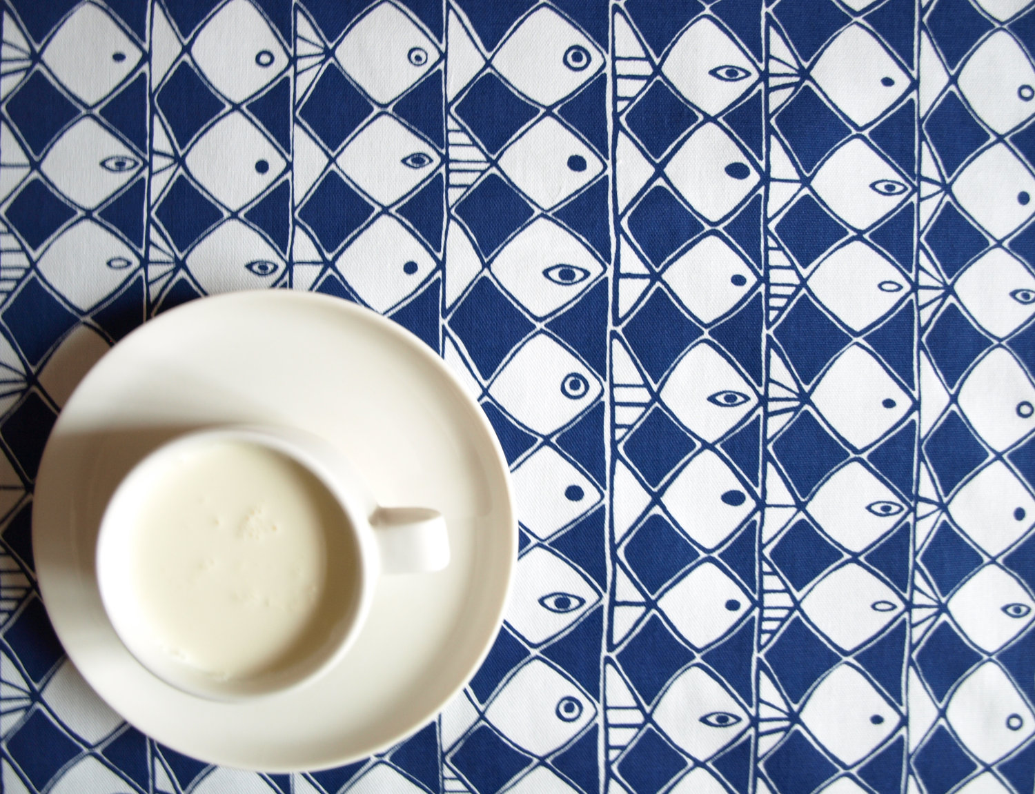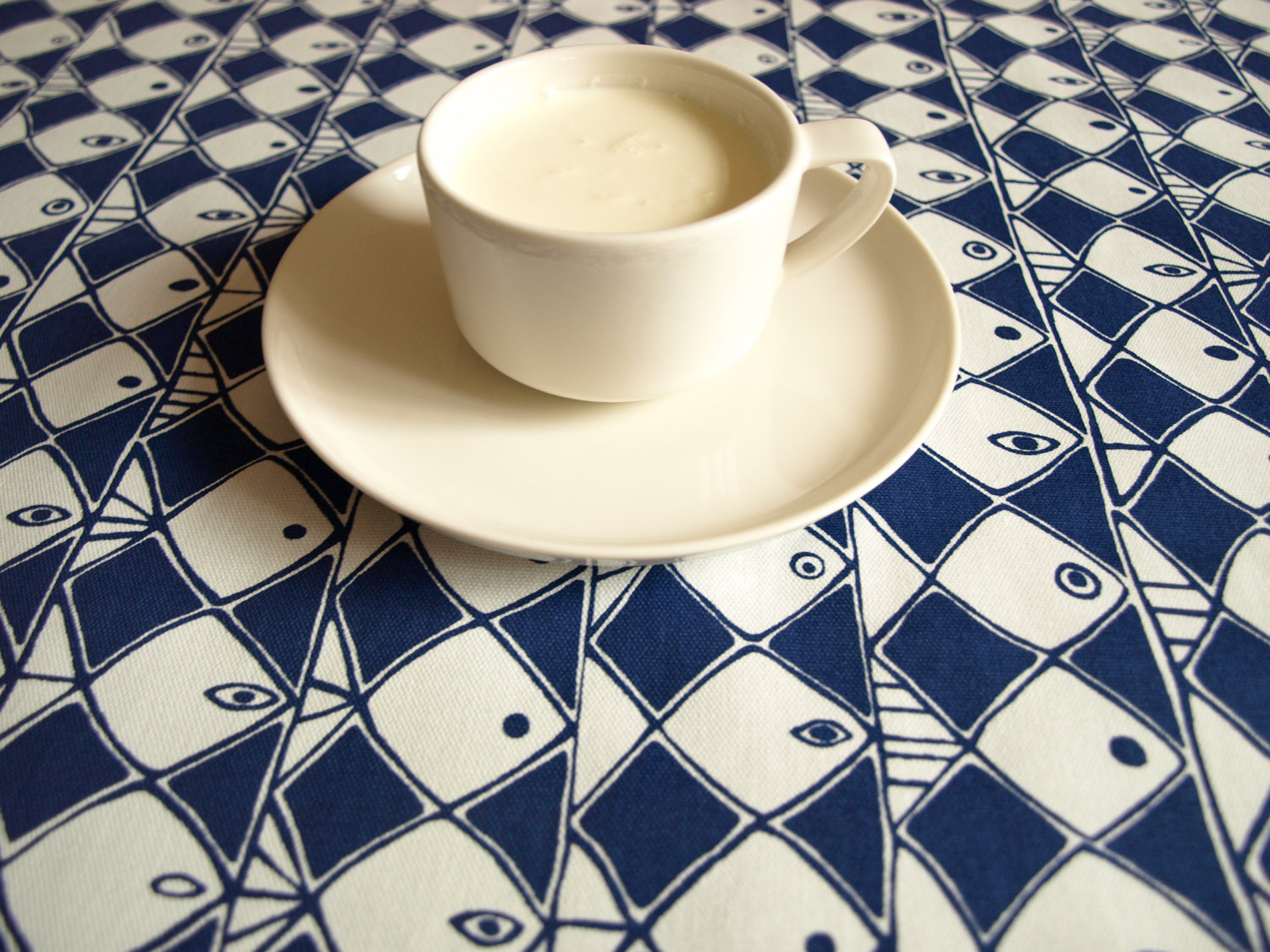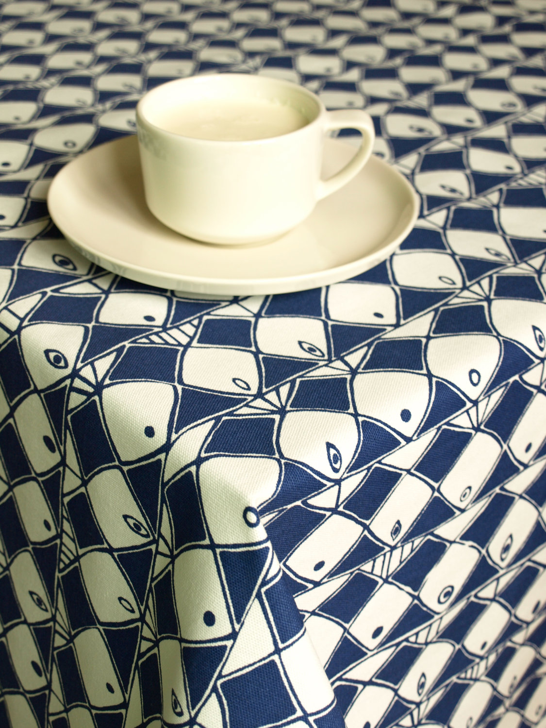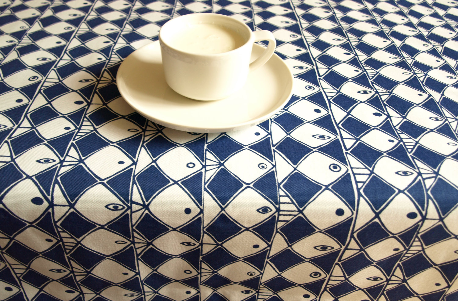 Tablecloth white navy blue abstract fishes , also napkins, table runner , pillow , curtains available, great GIFT
