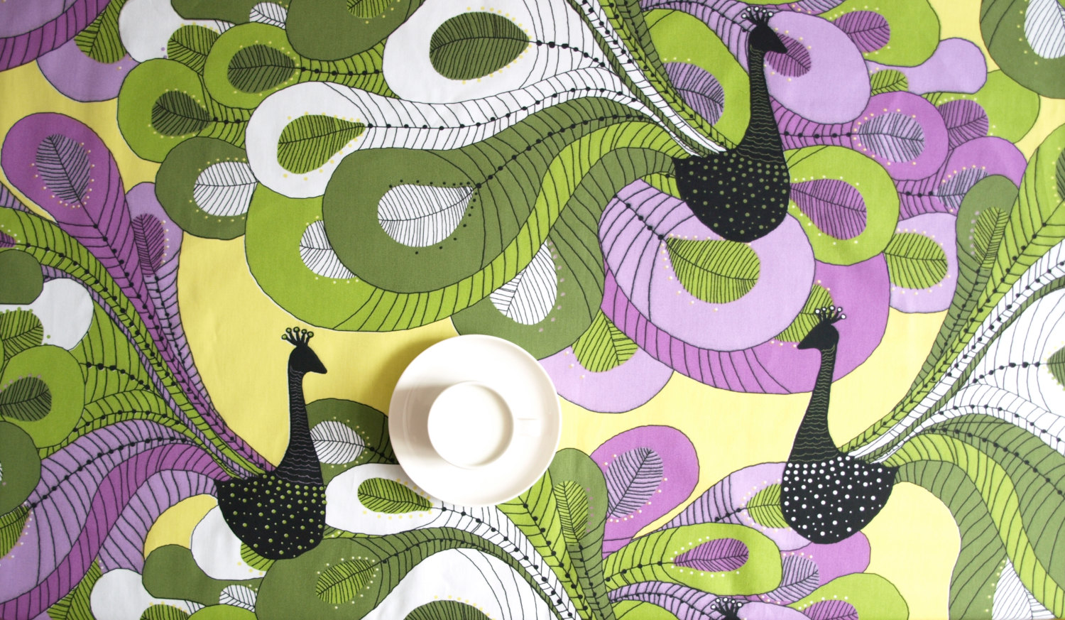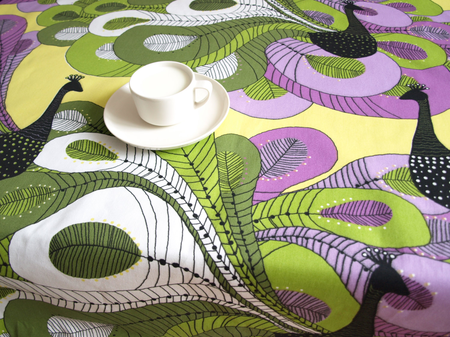 Tablecloth white olive green lillac black abstract peacock , also napkins , table runner , pillow , curtains available, great GIFT