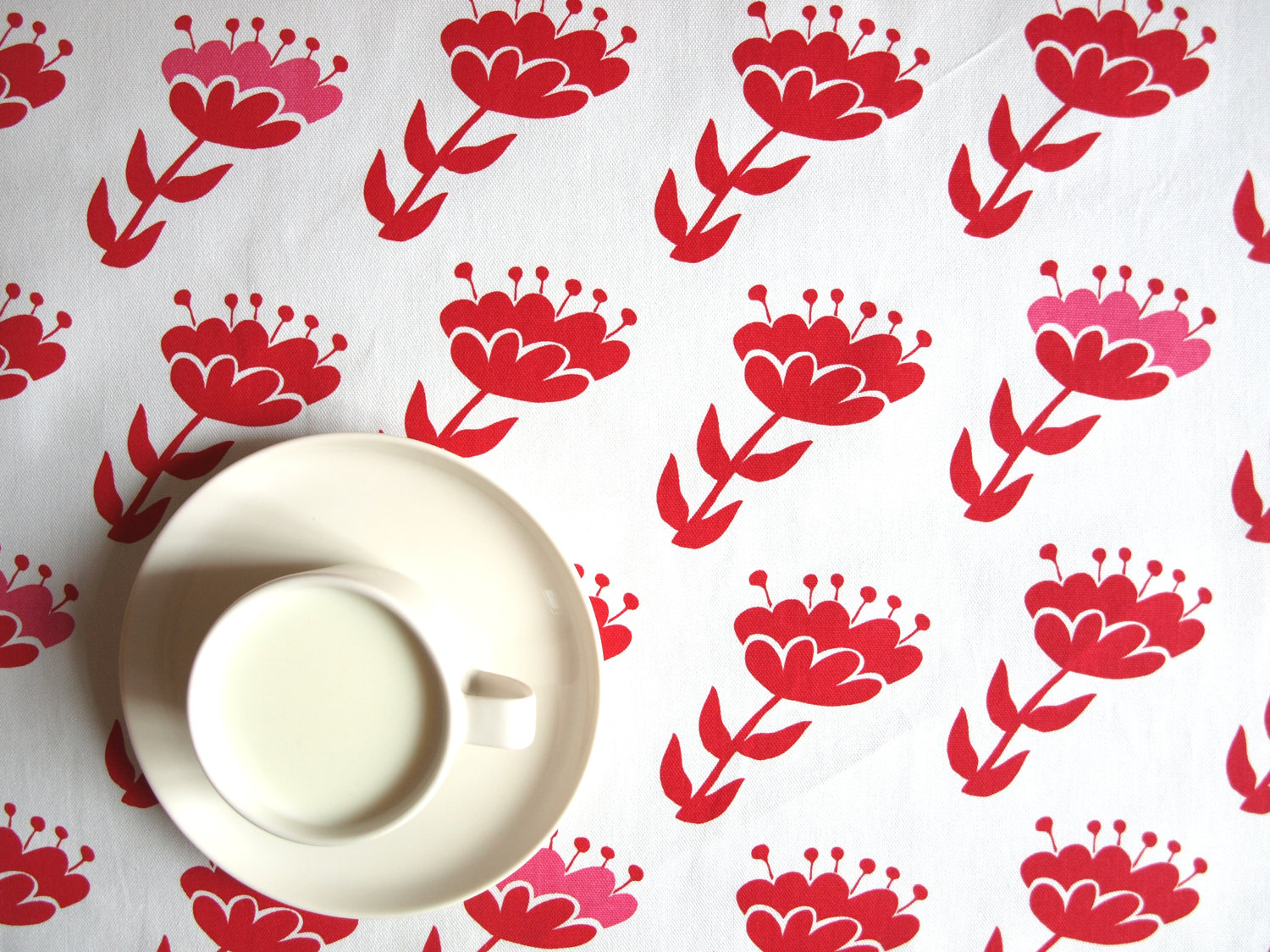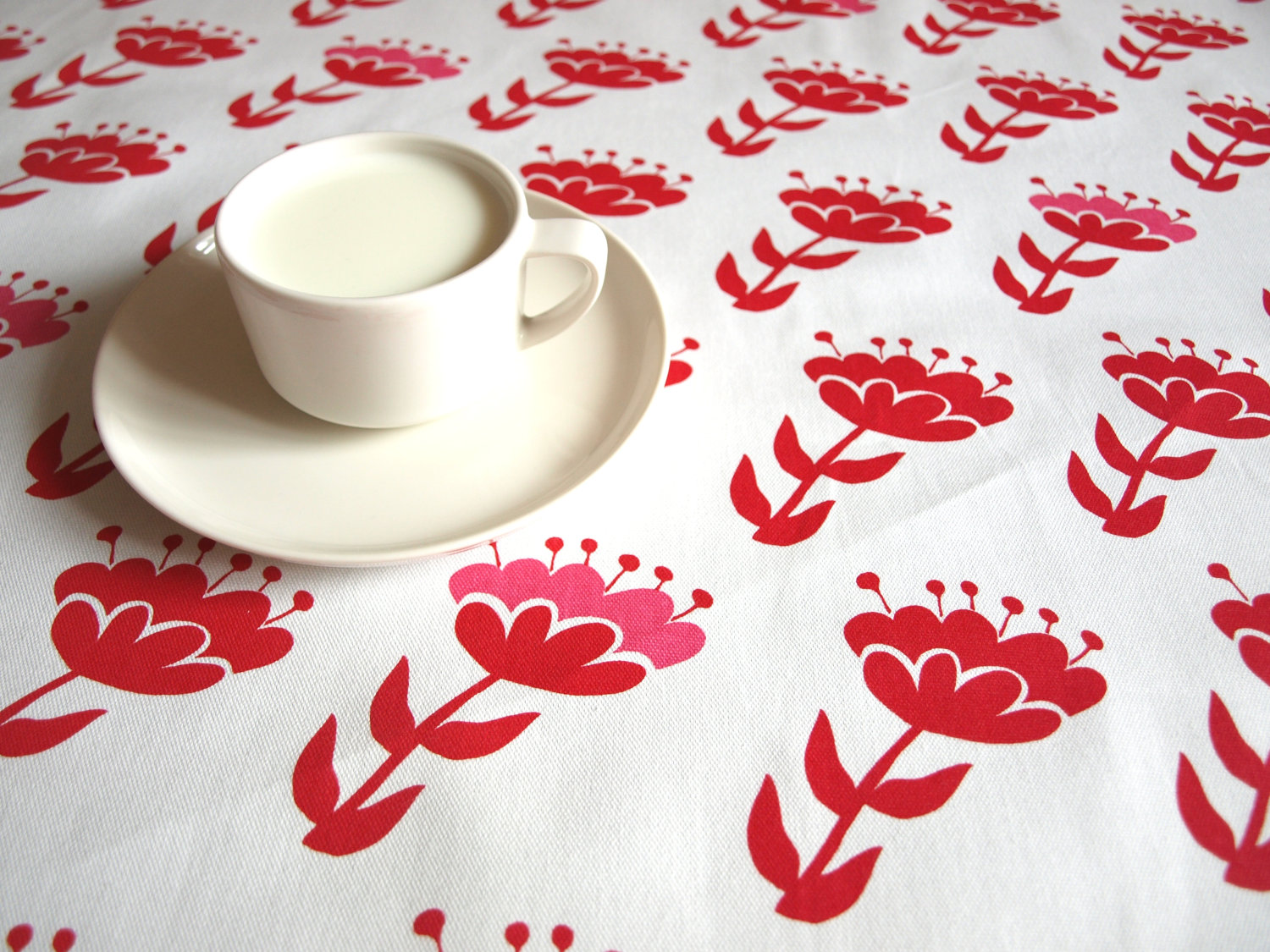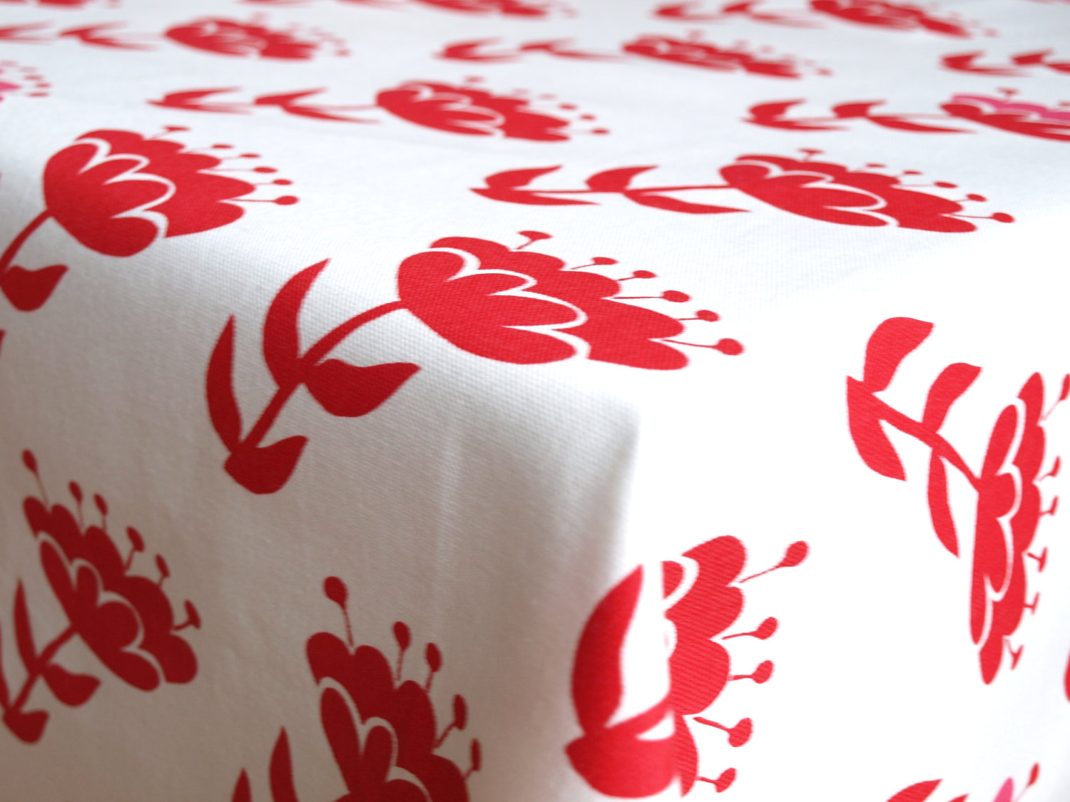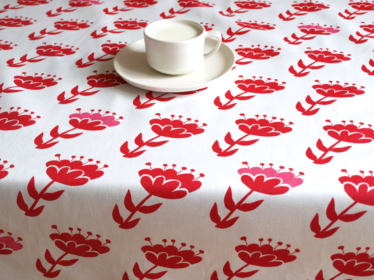 Tablecloth white red pink abstract flowers 37″x 37″ or made to order your size, also napkins, table runner available, with GIFT