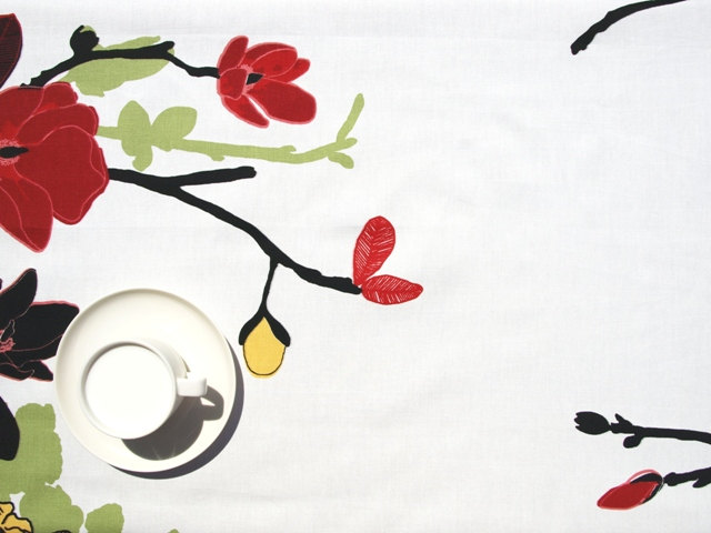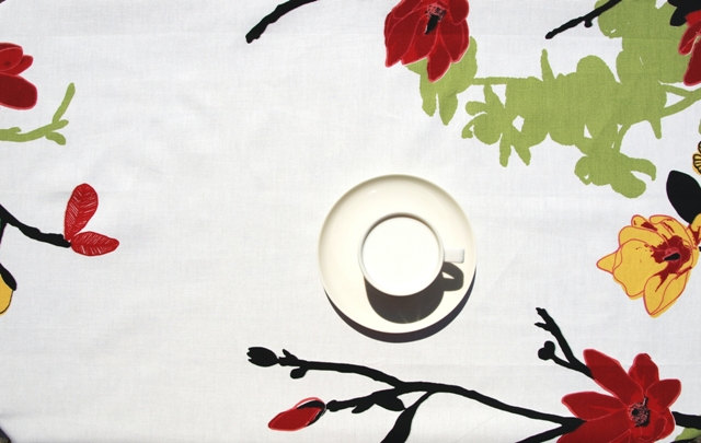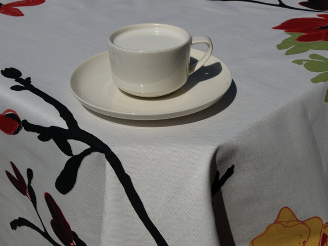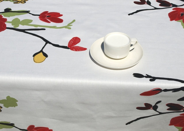 Tablecloth white yellow red flowers black green tree 37″x56″ or order your size, runner , napkins , curtains , pillows available, great GIFT