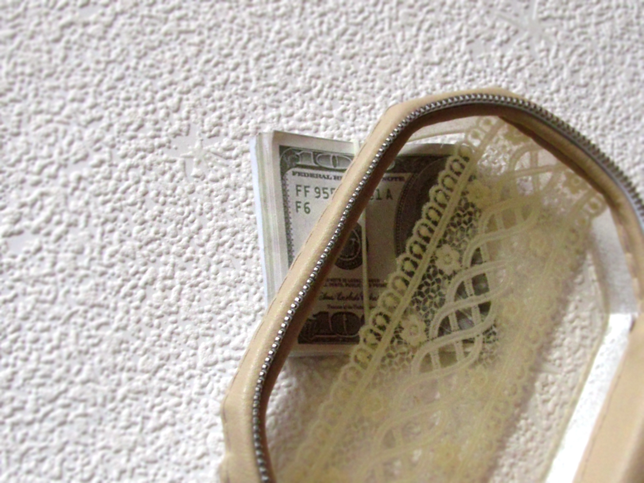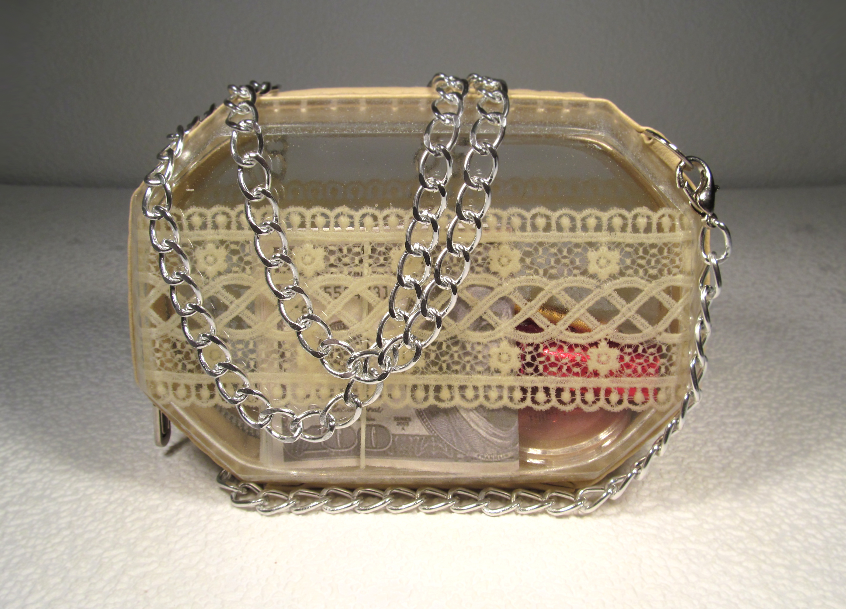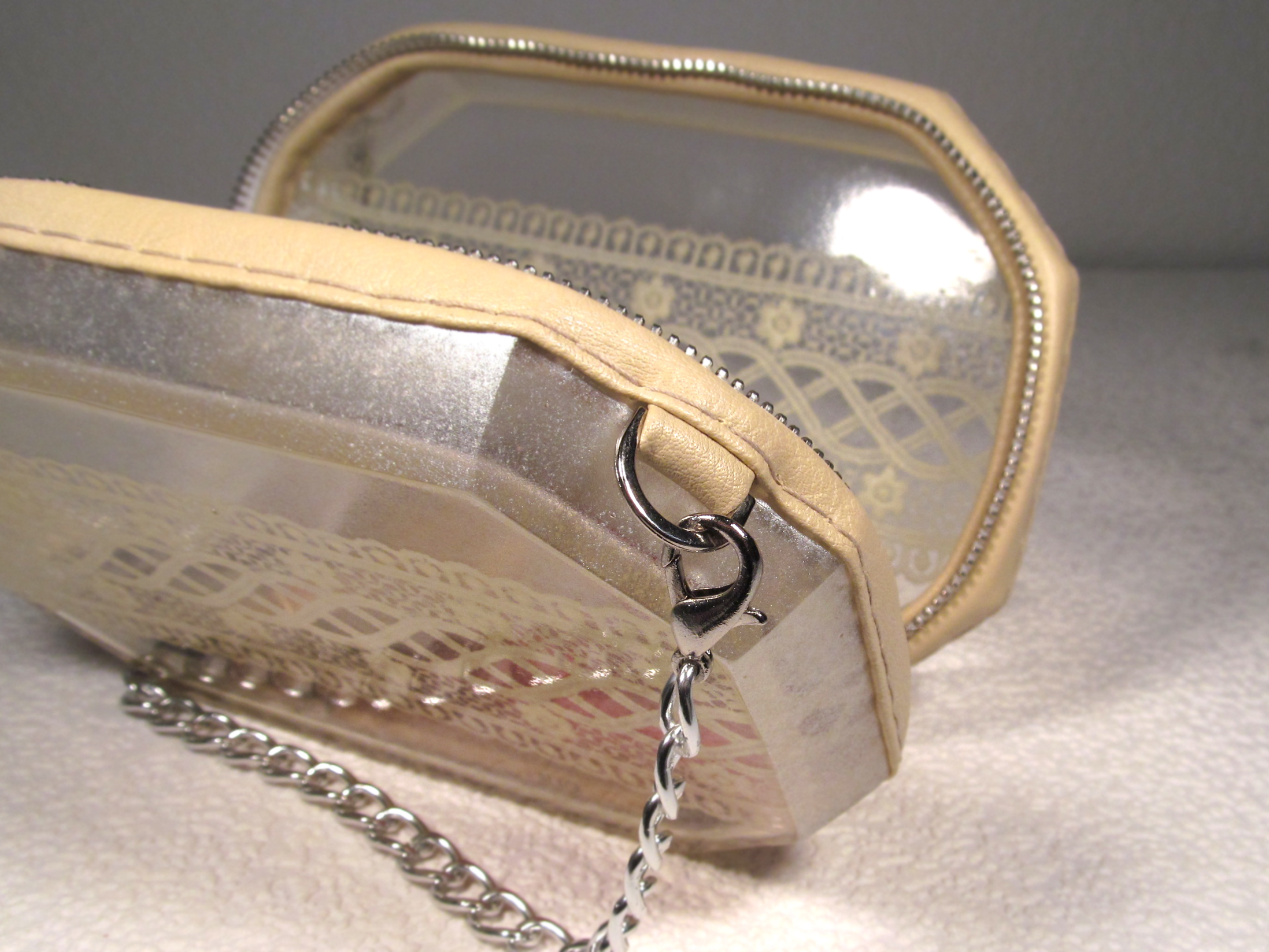It is made of polymer (resin) and lace. Around the clutch has a zipper and satin.