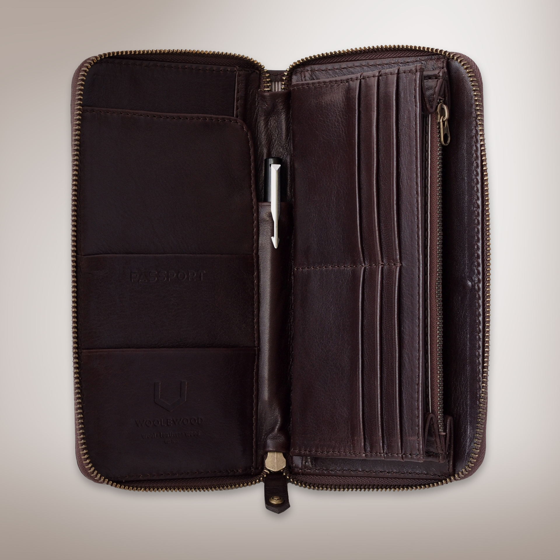 • Тревеллер-портмоне THE BRIDGE станет Вашим помощником, если Вы опытный путешественник, который не любит суету в дороге. Создавая этот вместительный кошелек, мы мысленно собирали Вас в поездку: паспорт, деньги, посадочный талон, кредитка, водительское удостоверение – это все найдет свое отдельное место в тревеллер-портмоне. В карман на молнии можно положить важную мелочь, и, если нужно взять с собой ручку – Вы найдете и для нее надежное крепление. Ничего из этого Вы не потеряете по пути – портмоне полностью застегивается на молнию.