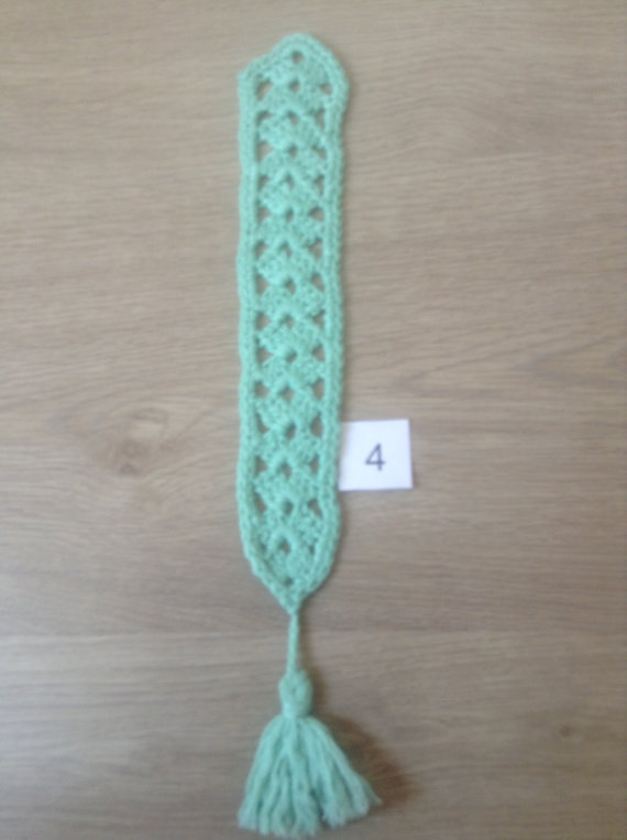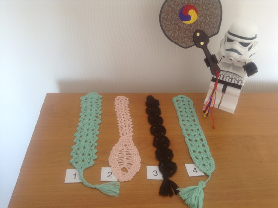 Selection of four differently coloured hand-knitted crochet bookmarks, in different designs.