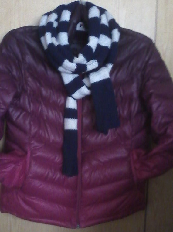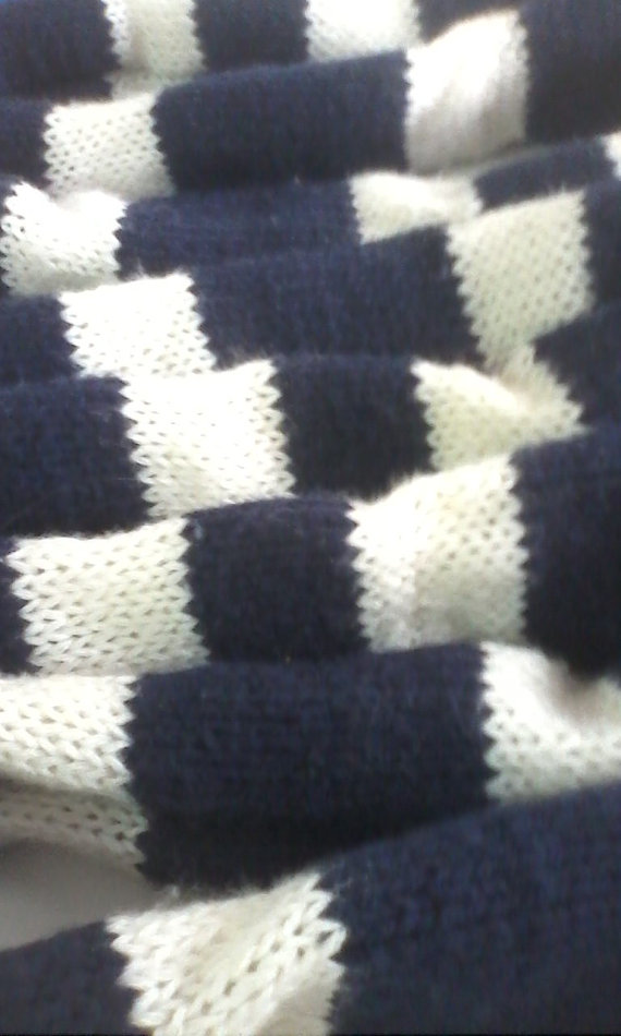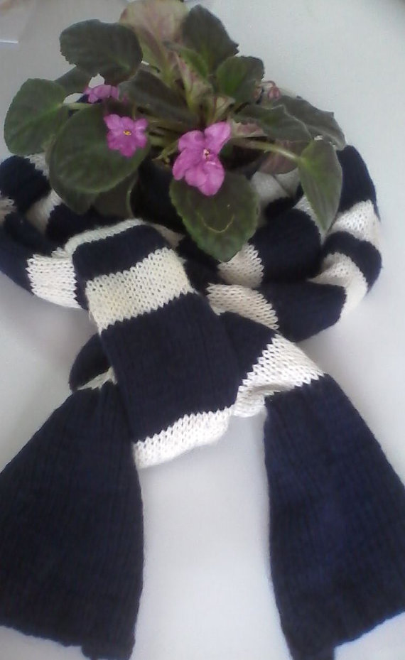 Long scarf is hand knit in gorgeous dark blue and white color stripes and can be worn by men or women. Scarf is very long and soft.
