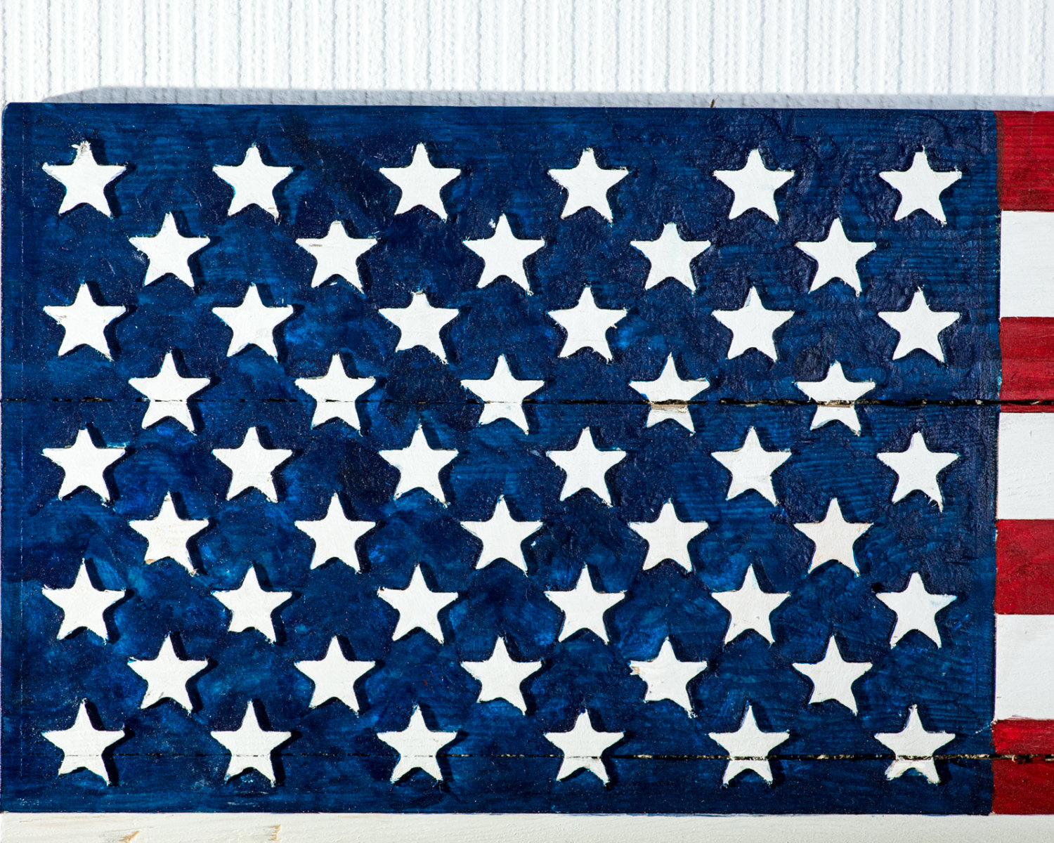 Unique and stylish display of the strongest symbol of the USA – American flag carved into the palette wood. Hand painted. Rustic style display of an American icon.